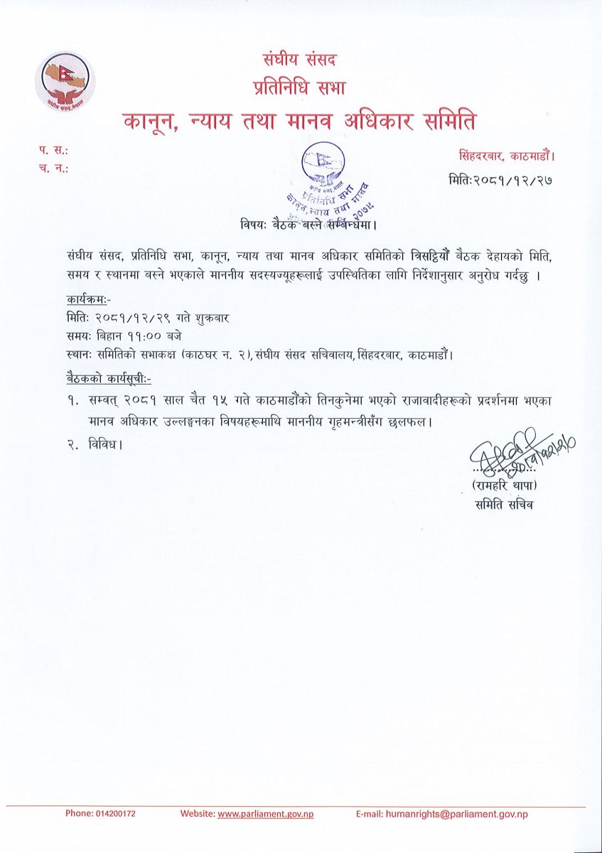 समिति सचिवालयका अनुसार २०८१ साल चैत १५ गते काठमाडौंको तीनकुनेमा भएको राजावादीहरूको प्रदर्शनमा भएका मानवअधिकार उलङ्घनका बिषयहरू माथी माननीय गृहमन्त्रीसँग छलफल हुनेछ ।