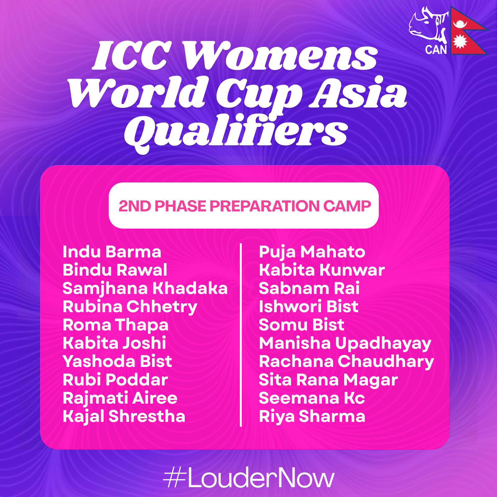 नेपाल क्रिकेट सङ्घ (क्यान)ले आइसीसी महिला विश्वकप क्रिकेट एसिया छनोटका लागि दोस्रो चरणको बन्द प्रशिक्षणका २० खेलाडीलाई बोलाएको छ।