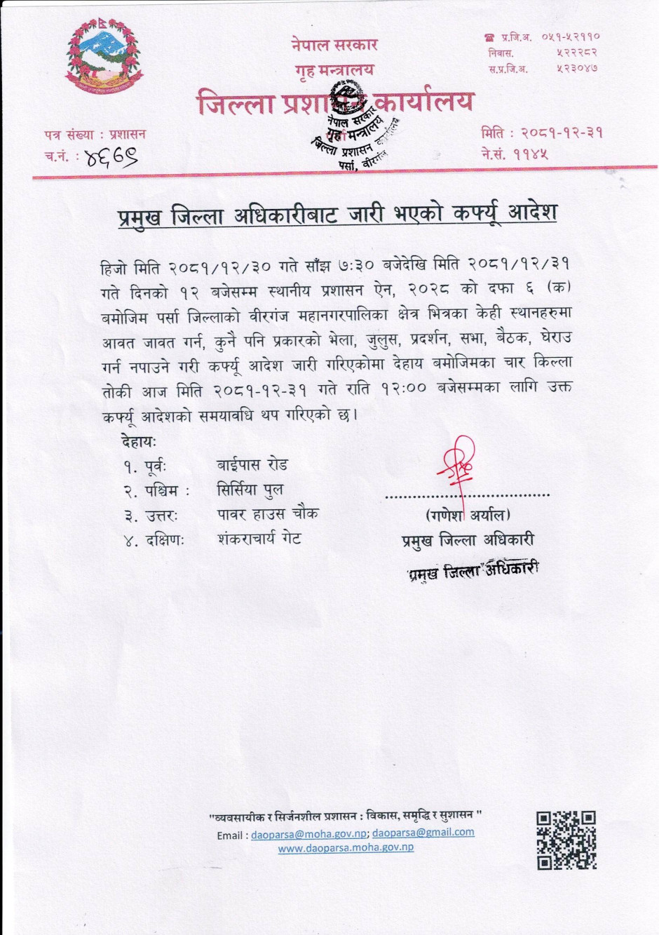 पर्साका प्रमुख जिल्ला अधिकारी गणेश अर्यालले कर्फ्युको समय थप गरेका हुन् ।