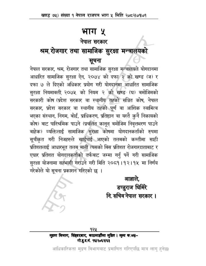 श्रम रोजगार तथा सामाजिक सुरक्षा मन्त्रालयका निमित्त सचिव डण्डुराज घिमिरेका अनुसार नयाँ वर्ष, २०८२ को पहिलो दिन राजपत्रमा सोसम्बन्धी सूचना प्रकाशन गरिएको छ।