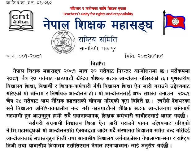 देशभरका सबै विद्यालय अनिश्चितकालीन बन्द गरी काठमाडौँको शैक्षिक सडक आन्दोलनमा अनिवार्य सहभागी हुन प्रधानाध्यापक, शिक्षक, कर्मचारी लाई महासंघले आग्रह समेत गरेको छ ।