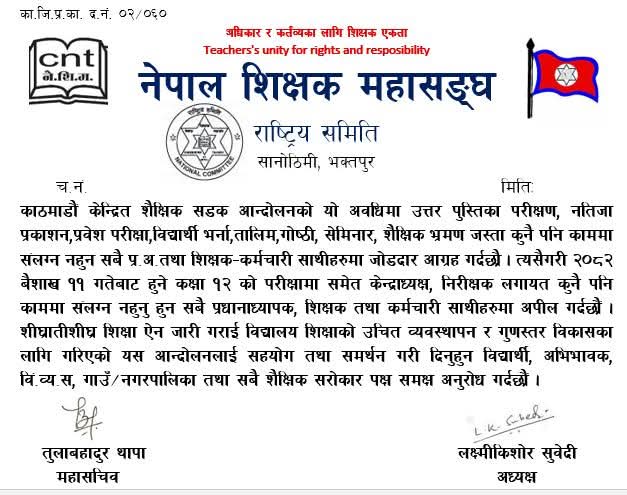 नेपाल शिक्षक महासंघले कक्षा १२ को परीक्षा सञ्चालनमा सहभागी नहुने निर्णय गरेको छ ।