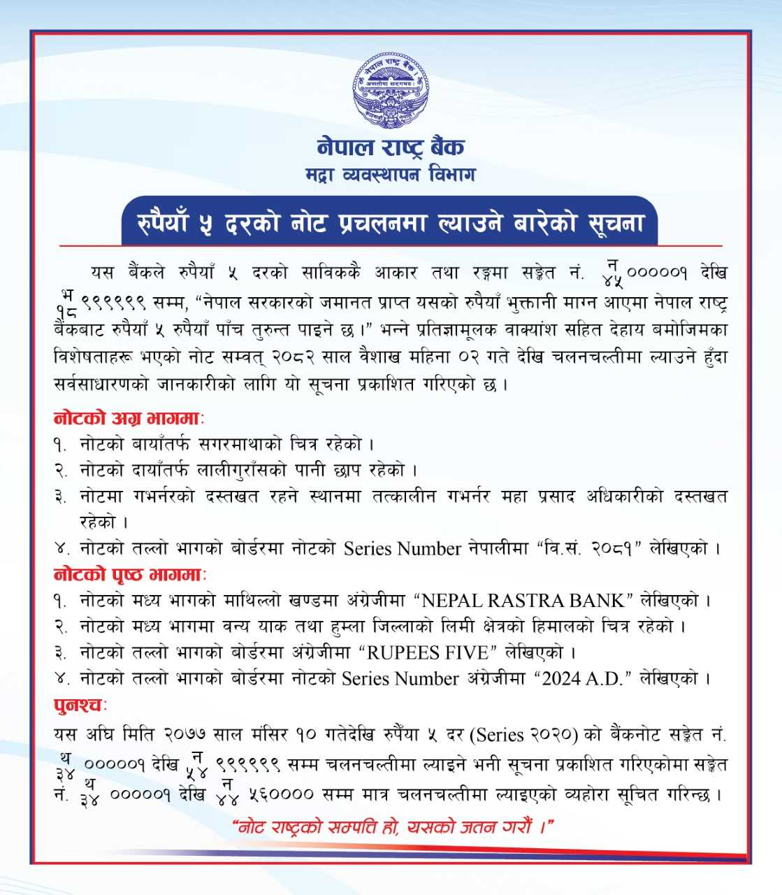 राष्ट्र बैंकले मंगलबार सूचना जारी गरेर निवर्तमान गभर्नर महाप्रसाद अधिकारीको हस्ताक्षर रहने गरी साबिककै आकार तथा रङमा ५ रुपैयाँ दरका नयाँ नोट चलनचल्तीमा ल्याएको जानकारी दिएको हो ।