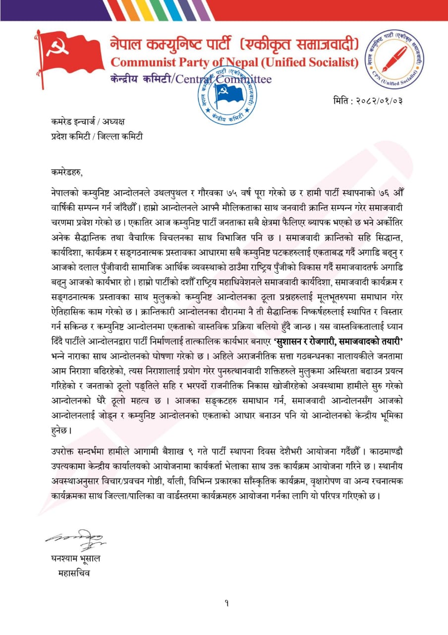 महासचिव घनश्याम भुसालले सातै प्रदेश र जिल्लाका अध्यक्ष र इन्चार्जलाई पत्र लेख्दै उक्त दिन पार्टी स्थापना दिवस मनाउन सर्कुलर पठाएका हुन् ।