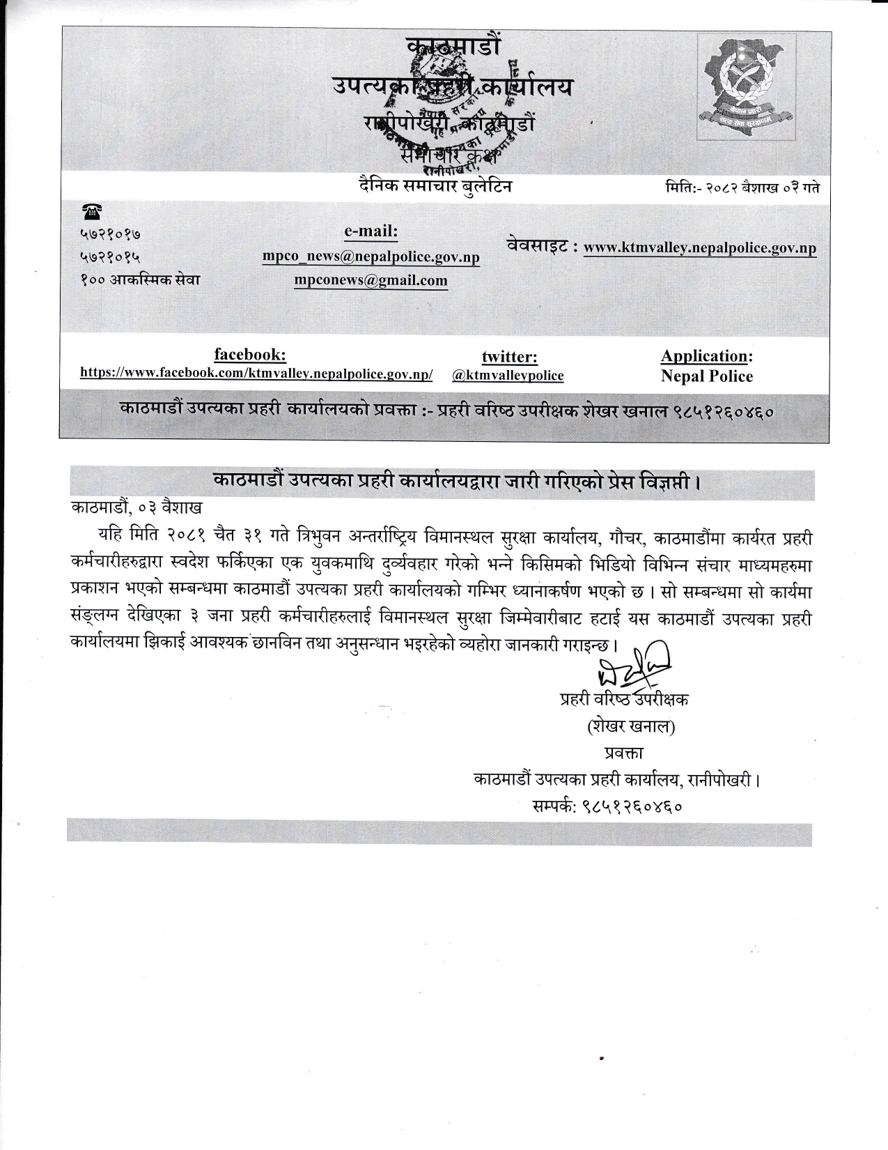 गत चैत ३१ गते त्रिभुवन अन्तर्राष्ट्रिय विमानस्थल सुरक्षा कार्यालय, गौचर, काठमाडौँमा कार्यरत प्रहरी कर्मचारीहरुले स्वदेश फर्किएका एक युवकमाथि दुर्व्यवहार गरेको भन्ने भिडिओ सामाजिक सञ्जालमा भाइरल भएको थियो ।