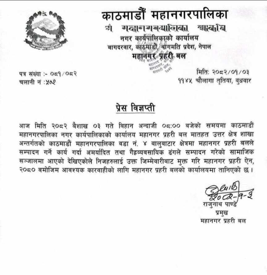 उक्त कार्य अमर्यादित तथा गैह्र व्यवसायिक ढंगको भएको भन्दै महानगर प्रहरी ऐन, २०८० बमोजिम महानगर प्रहरी बल प्रमुख राजुनाथ पाण्डेले उनीहरूलाई जिम्मेवारीमुक्त गरी प्रहरी बलको कार्यालयमा तानेका हुन् ।