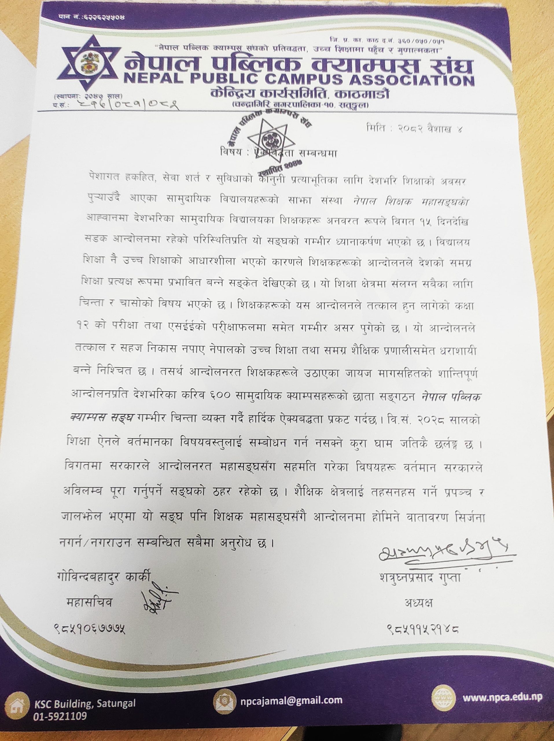 चैत्र २० गतेदेखि पेशागत हकहित, सेवा शर्त र सुबिधाको कानुनी प्रत्याभूतिका लागि देशभरि शिक्षाको अवसर पुर्याउँदै आएका सामुदायिक विद्यालयहरूको साझा संस्था नेपाल शिक्षक महासङ्घको आह्वानमा देशभरिका सामुदायिक विद्यालयका शिक्षकहरू विगत १५ दिनदेखि सडक आन्दोलनमा होमिरहेको अवस्थामा नेपाल पब्लिक क्याम्पस संघले शिक्षक आन्दोलनमा ऐक्यबद्धता जनाएको हो ।