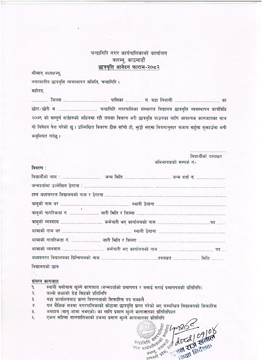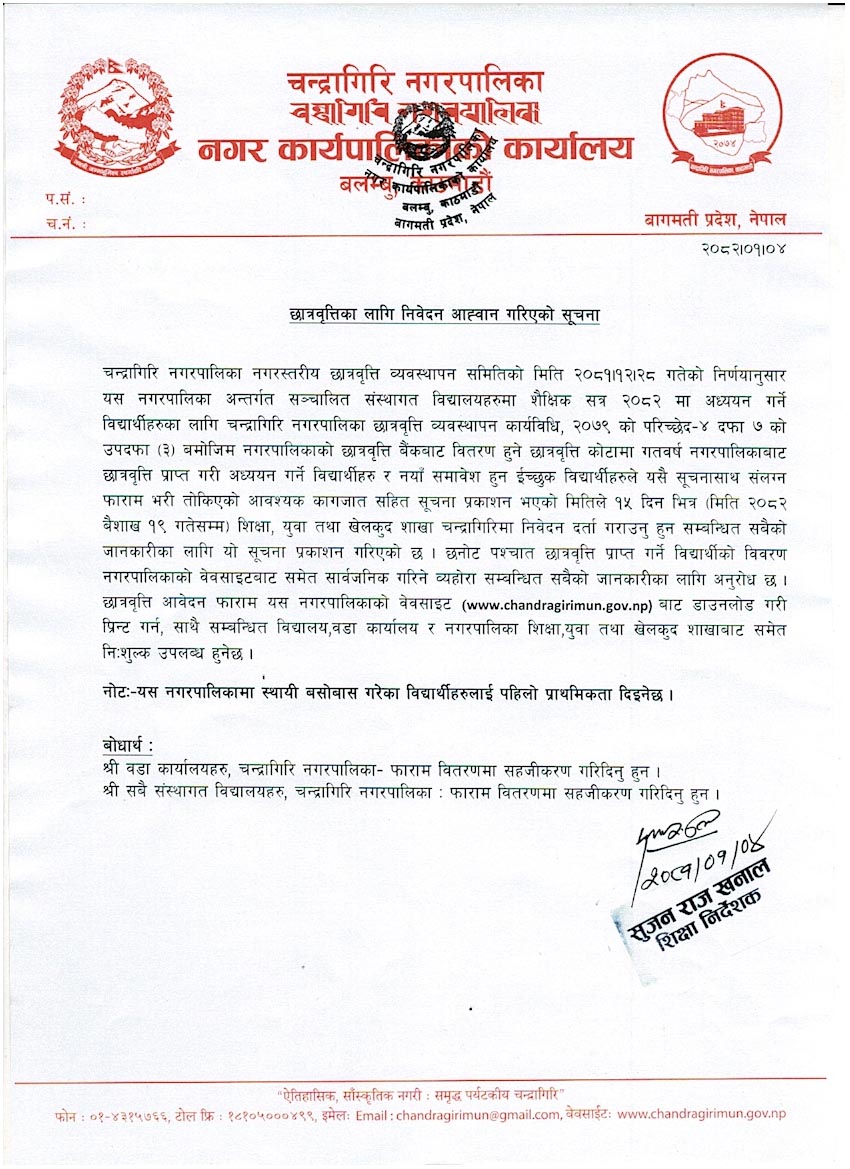 छात्रवृत्तिका लागि निवेदन दिन चाहने विद्यार्थीले चन्द्रागिरि नगरपालिका छात्रवृत्ति व्यवस्थापन कार्यविधि २०७९ को दफा ८ को उपदफा ६ बमोजिम आवश्यक कागजात साथ सम्बन्धित विद्यालयमा वैशाख १९ गतेसम्म बुझाउन अनुरोध गरेको छ ।