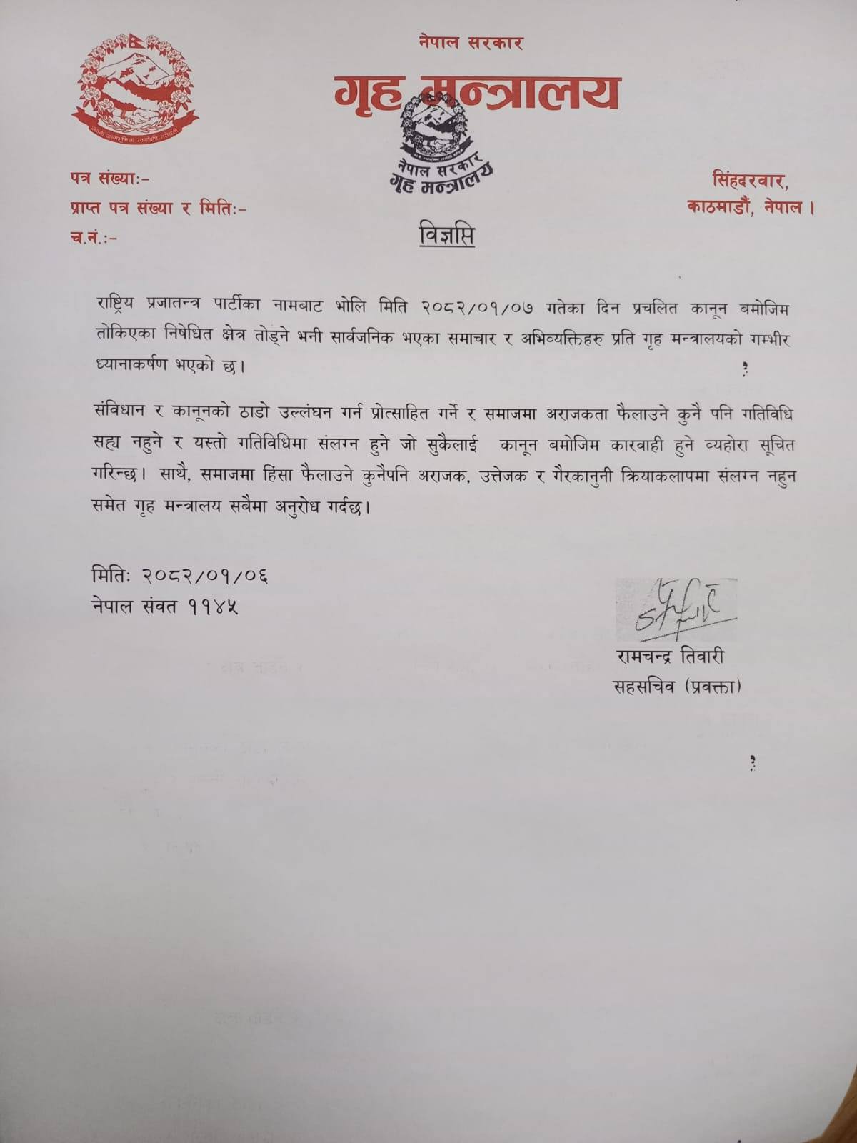 तर, यता राप्रपाले आइतबार निषेधित क्षेत्र तोड्ने भनेपछि गृह मन्त्रालयले संविधानको ठाडो उल्लंघन गर्न प्रोत्साहन गर्ने र समाजमा अराजकता फैलाउने कुनै पनि गतिविधि सह्य नहुने चेतावनी दिएको छ। ‘यस्तो गतिविधिमा संलग्न हुने जोसुकैलाई कानुन बमोजिम कारबाही हुने ब्योहरा सूचित गरिन्छ। साथै समाजमा हिंसा फैलाउने कुनै पनि अराजक, उत्तेजक र गैरकानुनी क्रियाकलापमा संलग्न नहुन समेत गृह मन्त्रालय सबैमा अनुरोध गर्दछ,’ विज्ञप्तिमा भनिएको छ।