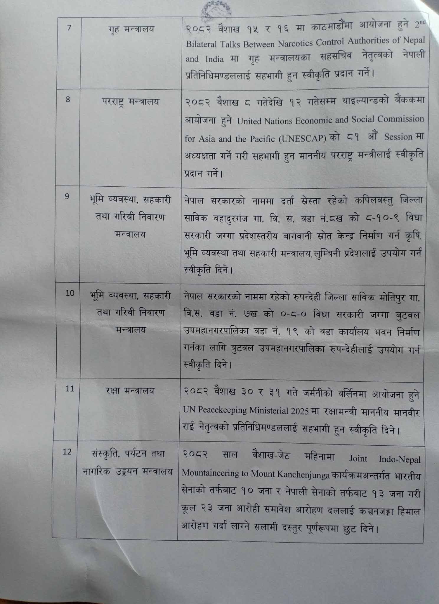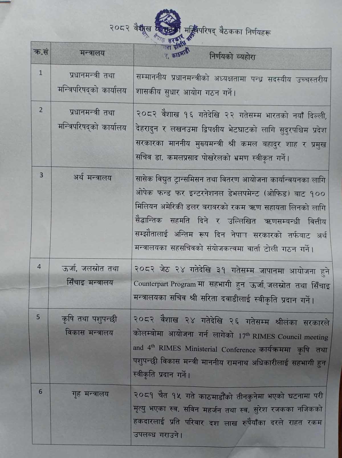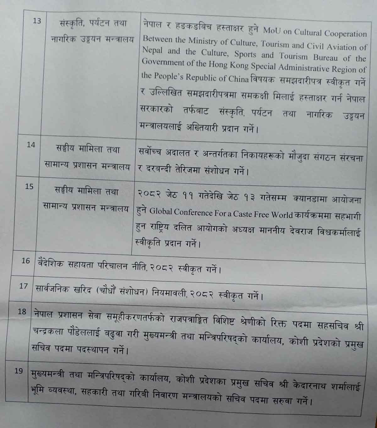 मन्त्रिपरिषद् बैठकका १९ निर्णयः