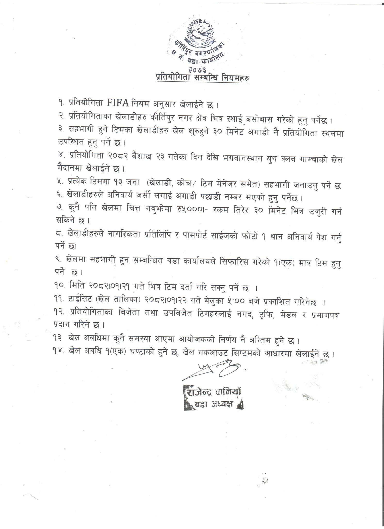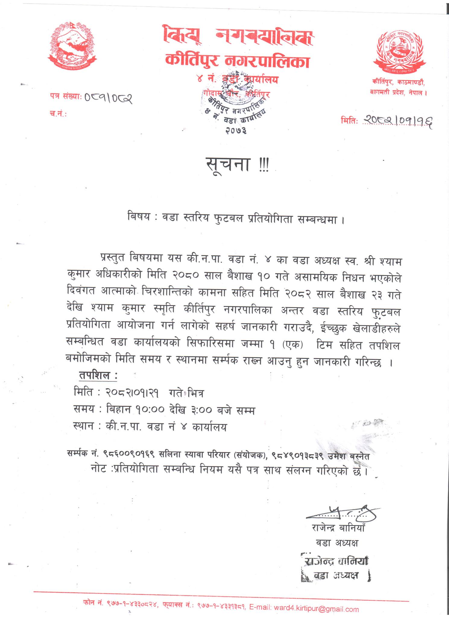 वडाध्यक्ष राजेन्द्र बानियाँका अनुसार यही बैशाख २३ गतेबाट सुरु हुने श्यामकुमार स्मृति कीर्तिपुर नगरपालिका अन्तर वडा स्तरीय फुटबल प्रतियोगितामा कीर्तिपुर नगरपालिका क्षेत्रभित्र स्थायी बसोबास गरेका खेलाडी सहभागी हुन सक्नेछन् ।