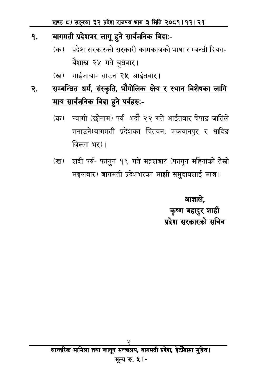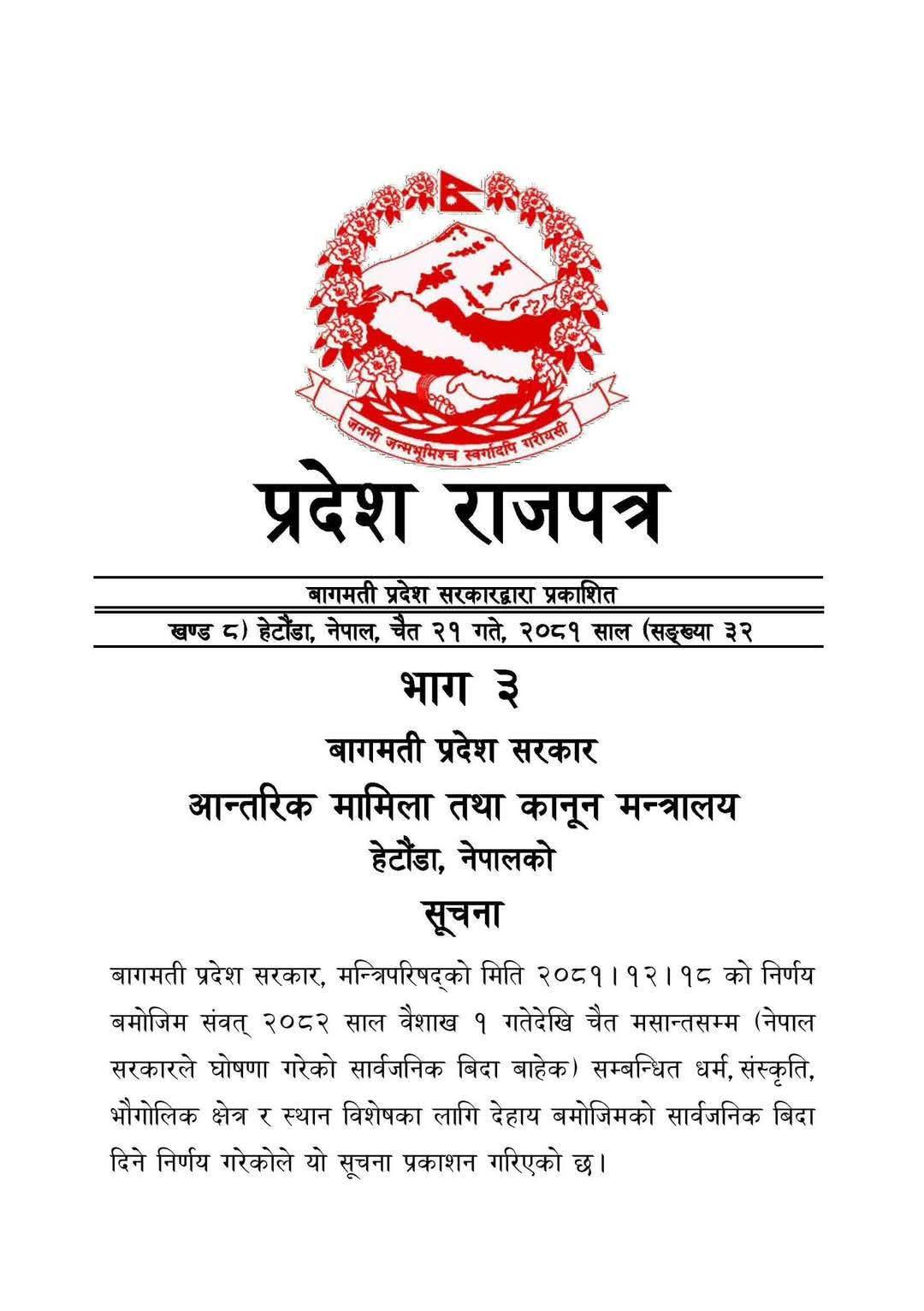 बैशाख २४ गते बुधबार बागमती प्रदेशमा सार्वजनिक बिदा