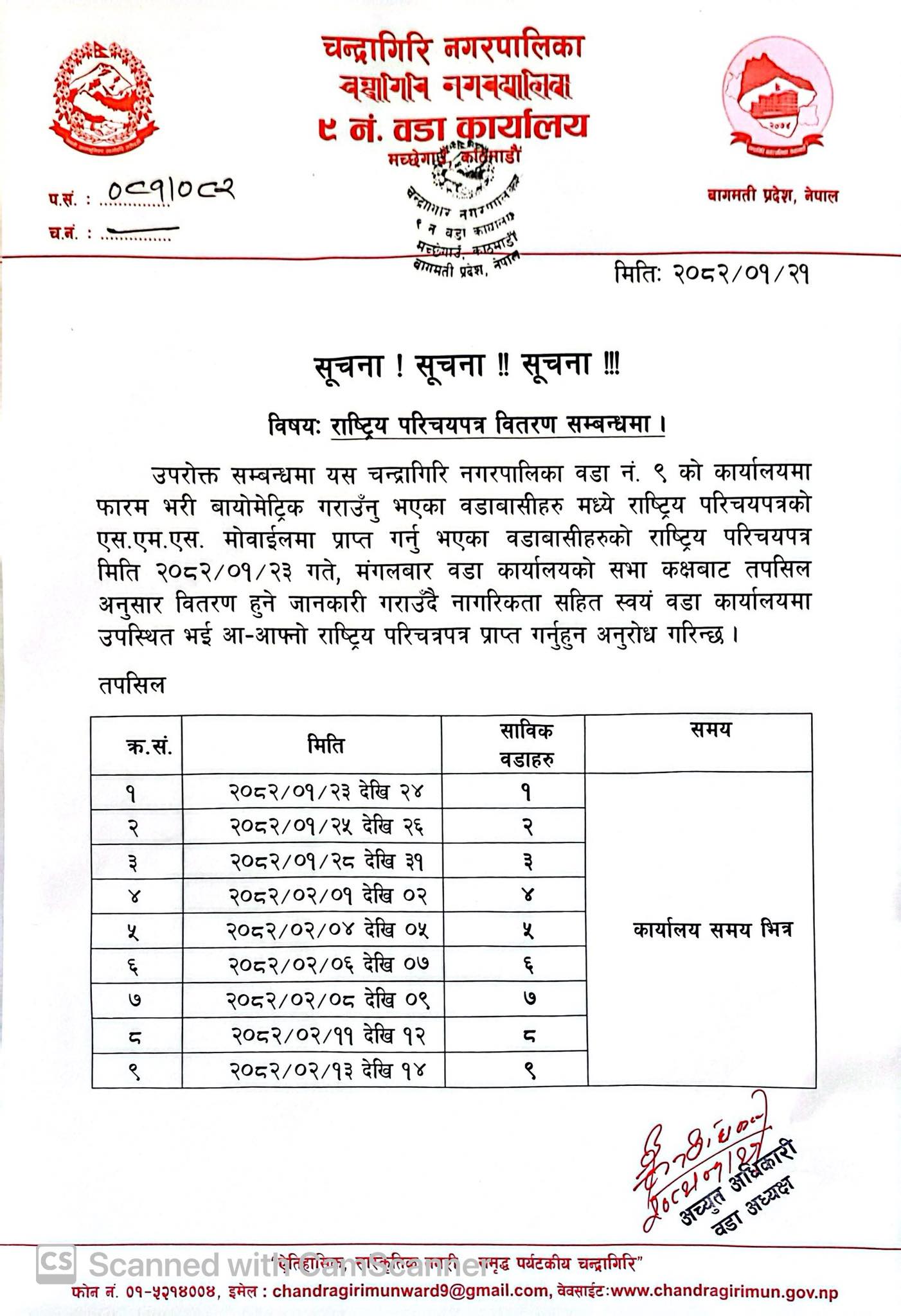 गत फागुन महिनाबाट चन्द्रागिरि नगरपालिकामा सुरु भएको परिचयपत्र वितरणको कार्य चन्द्रागिरि नगरपालिकाले वडा नं. ९ मच्छेगाउँमा बैशाख २३ गते मंगलबारबाट सुरु हुने बताइएको छ ।
