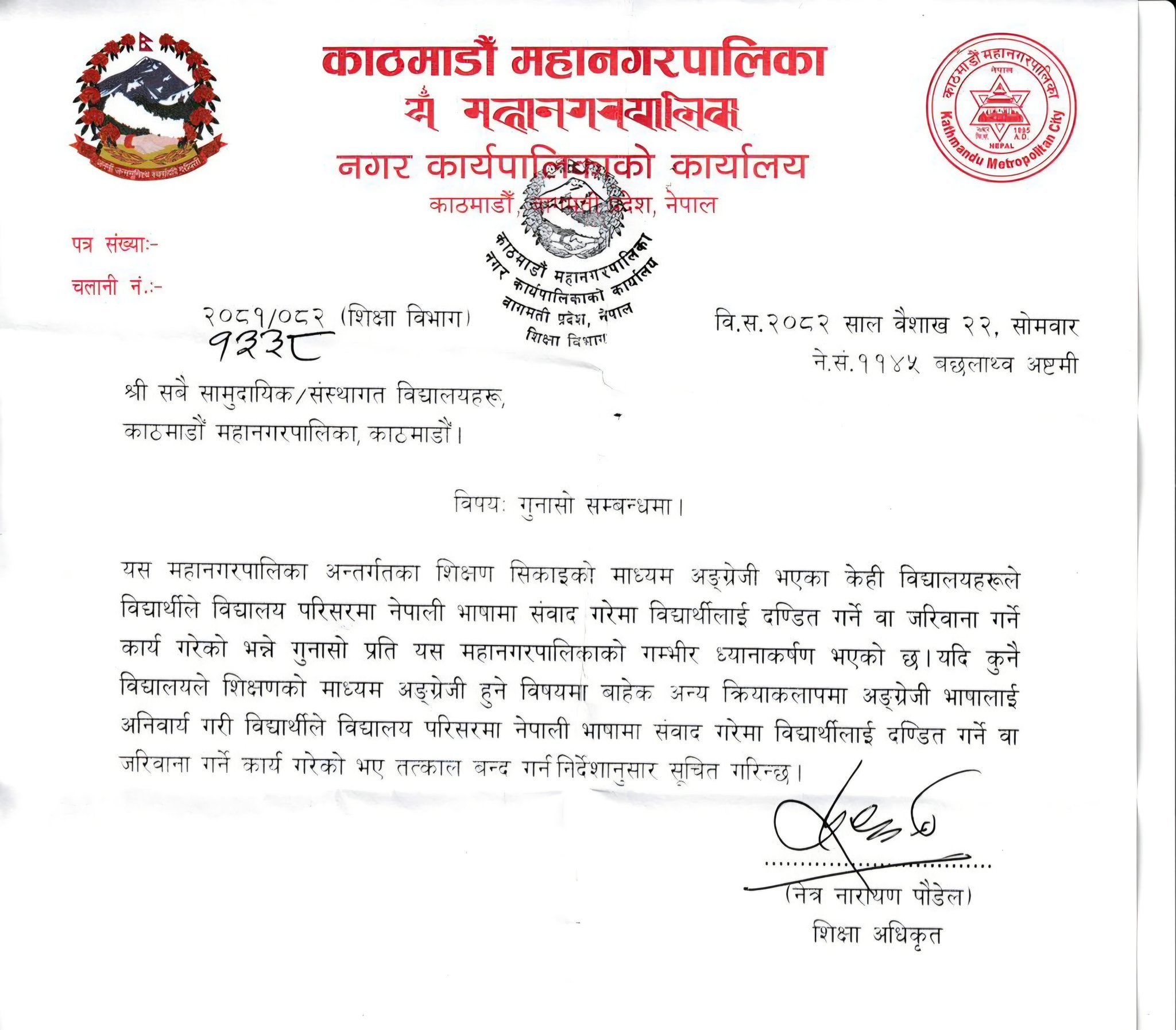 “यदि कुनै विद्यालयले शिक्षणको माध्यम अंग्रेजी हुने विषयमा बाहेक अन्य क्रियाकलापमा अंग्रेजी भाषालाई अनिवार्य गरी विद्यार्थीले विद्यालय परिसरमा नेपाली भाषामा संवाद गरेमा विद्यार्थीलाई दण्डित गर्ने वा जरिवाना गर्ने कार्य गरेको भए तत्काल बन्द गर्न निर्देशानुसार सूचित गरिन्छ,” महानगरको शिक्षा विभागले भनेको छ ।