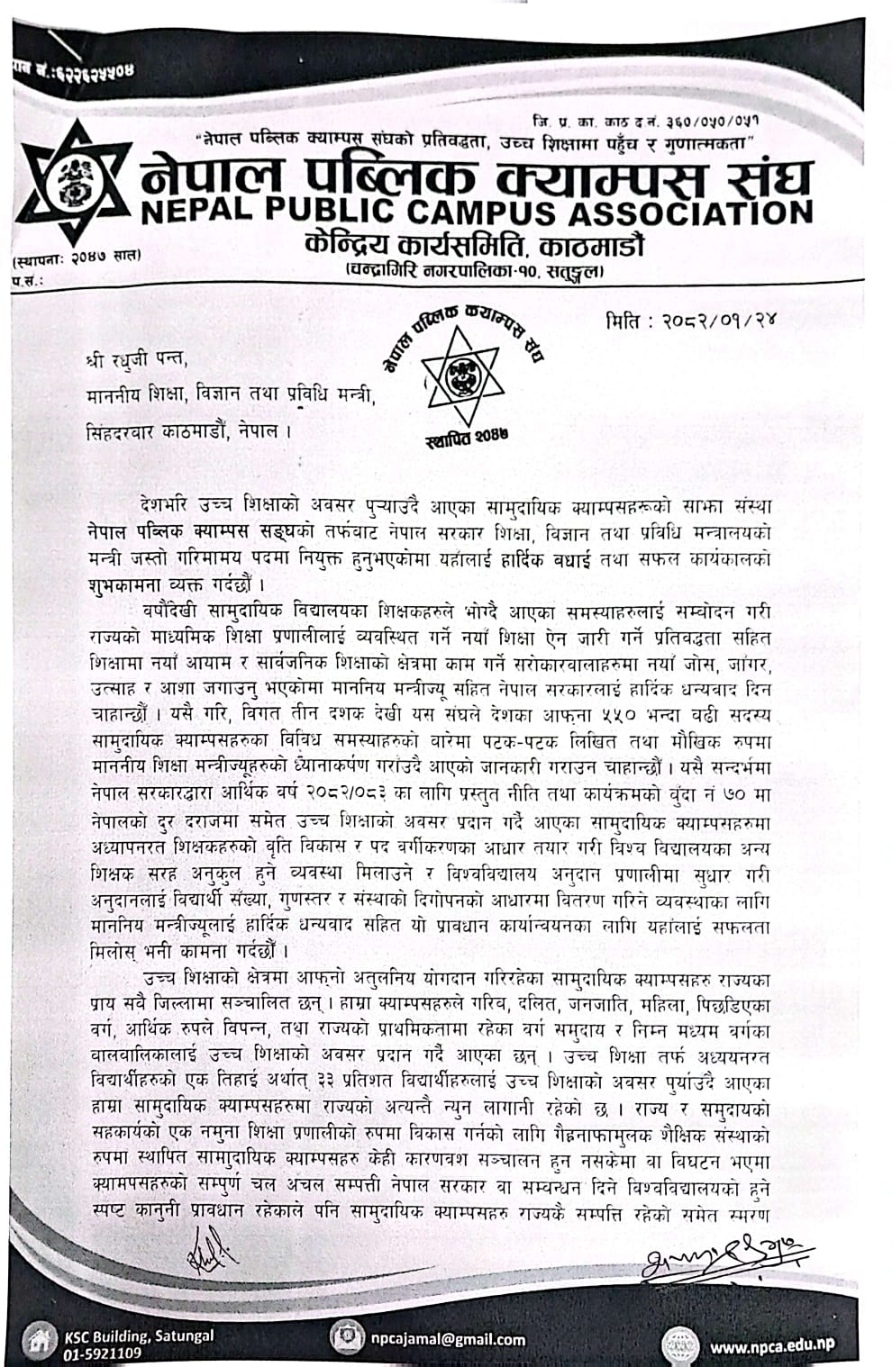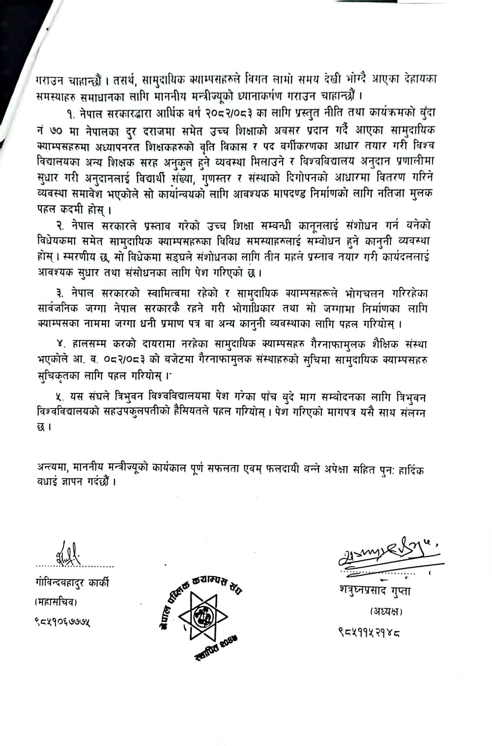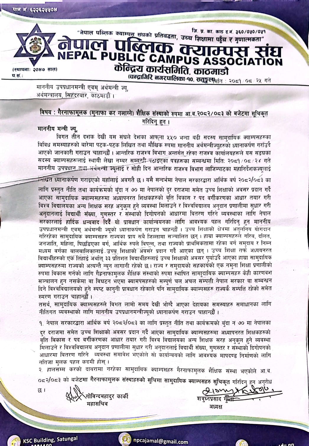 यस्ता छन नेपाल पब्लिक क्याम्पस संघले बुधबार अर्थ मन्त्री र शिक्षा मन्त्रीसमक्ष बुझाएको माग पत्रः