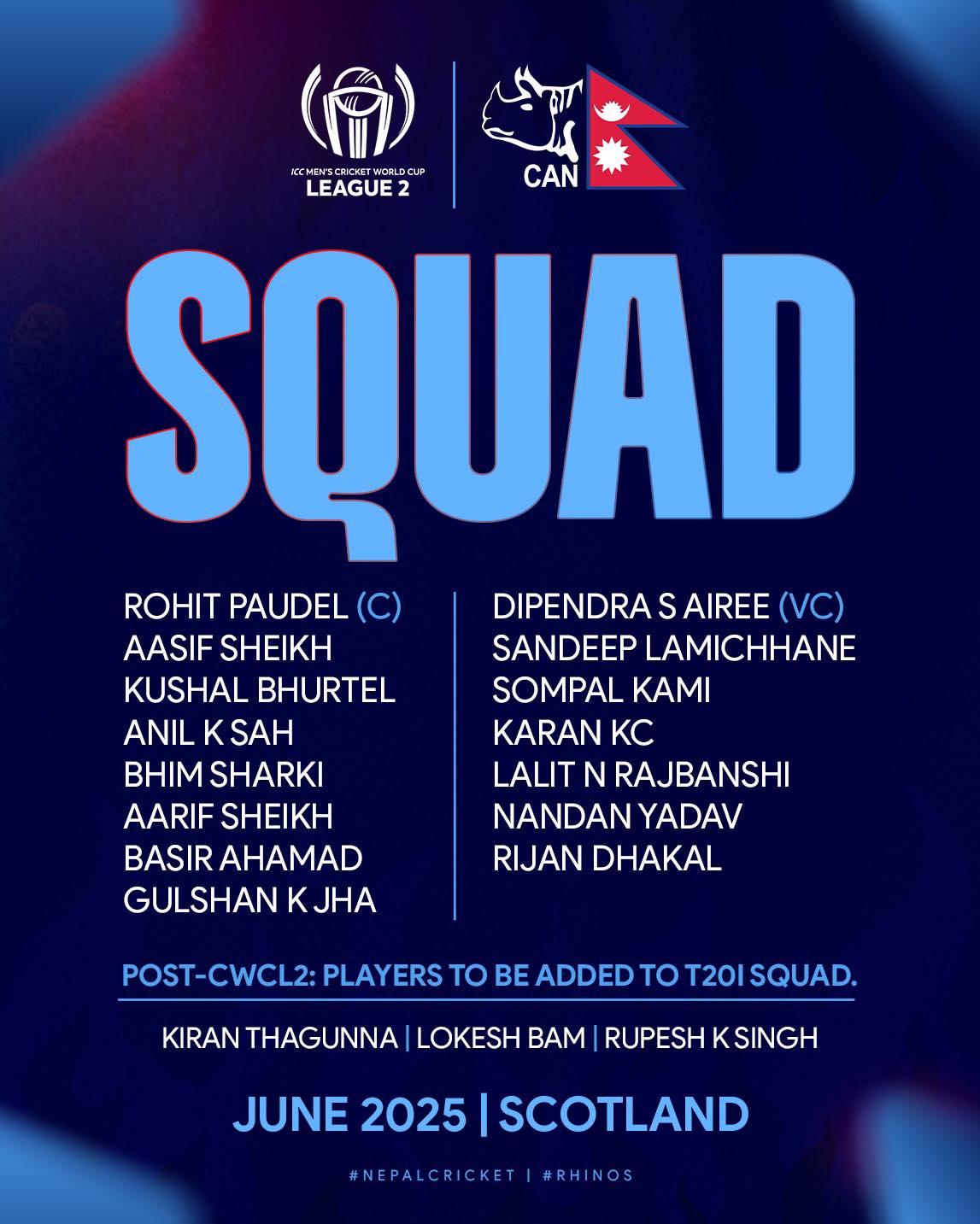 आइसिसी क्रिकेट विश्वकप लिग-२ मा सहभागिता जनाउने नेपाली राष्ट्रिय क्रिकेट टोली घोषणा गरिएको छ।