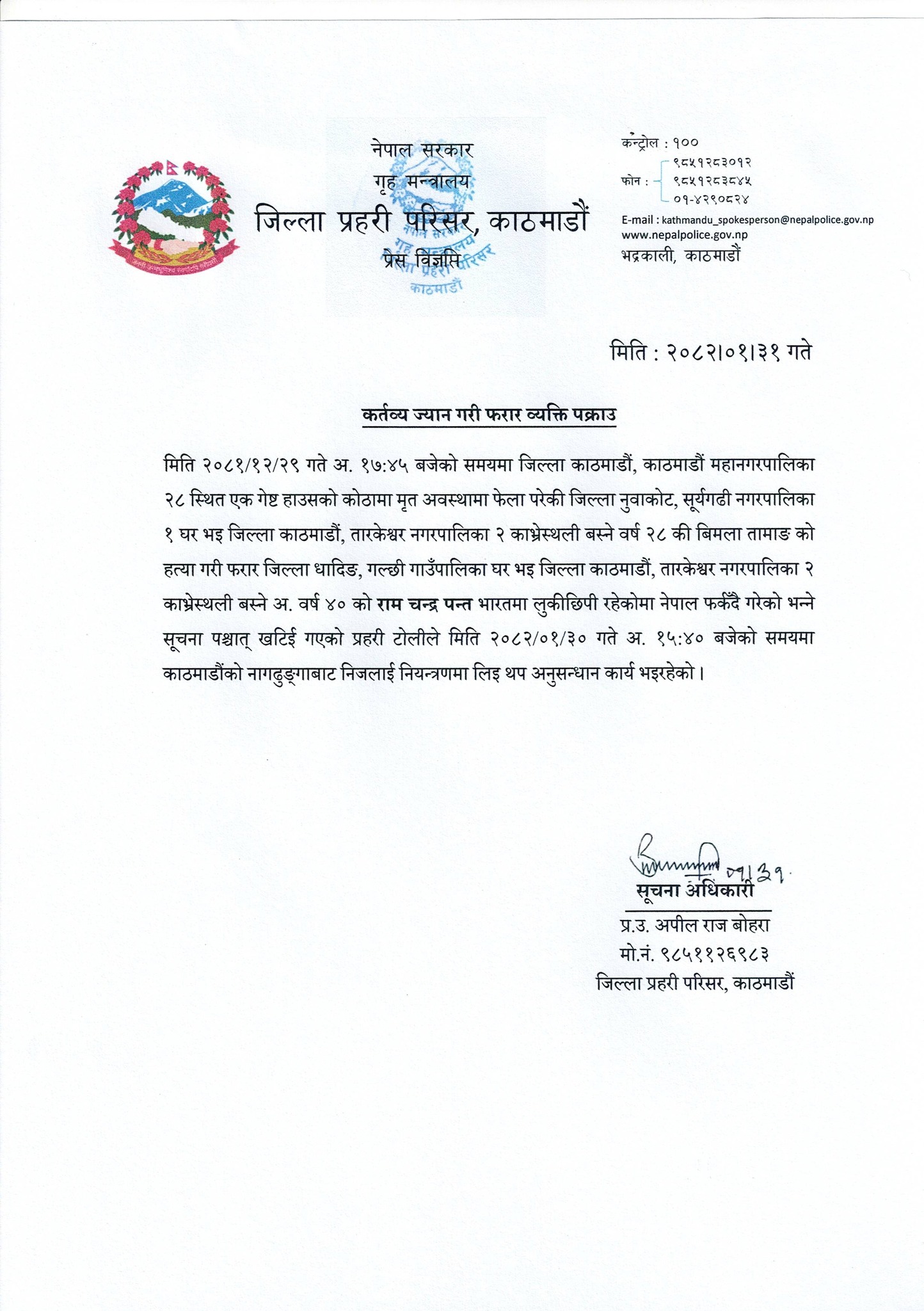 प्रहरीले धादिङ गल्छी गाउँपालिका घर भई तारकेश्वर नगरपालिका-२ काभ्रेस्थली बस्ने ४० वर्षीय रामचन्द्र पन्तलाई मंगलबार पक्राउ गरेको हो। परिसरका अनुसार उनी भारतीय पूर्व सैनिक हुन्।
