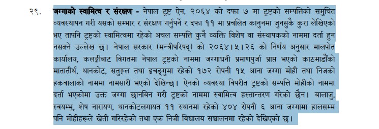 नेपाल ट्रष्ट ऐन, २०६४ को प्रावधानविपरीत ट्रष्टको स्वामित्वमा रहेको १७२ रोपनी १५ आना जग्गा मोही र निजको हकवालाको नाममा नामसारी भएको खुलेको छ।