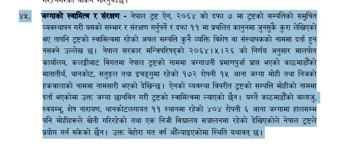 महालेखा परीक्षकको कार्यालयको ६२ औं प्रतिवेदनले ट्रष्टको सम्पत्ति संरक्षण र व्यवस्थापनमा गम्भीर लापरबाही भएको देखाएको हो।