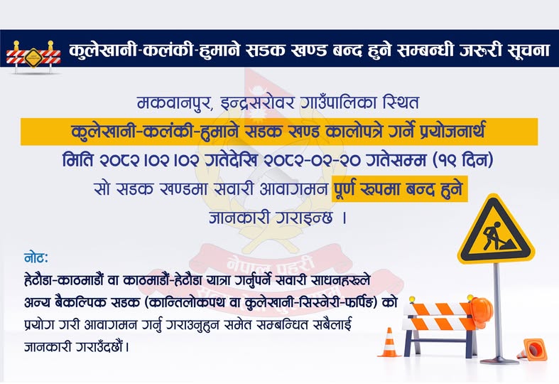 आजदेखि कुलेखानी-कलंकी-हुमाने सडक खण्ड १९ दिनसम्म पूर्ण रूपमा बन्द हुने