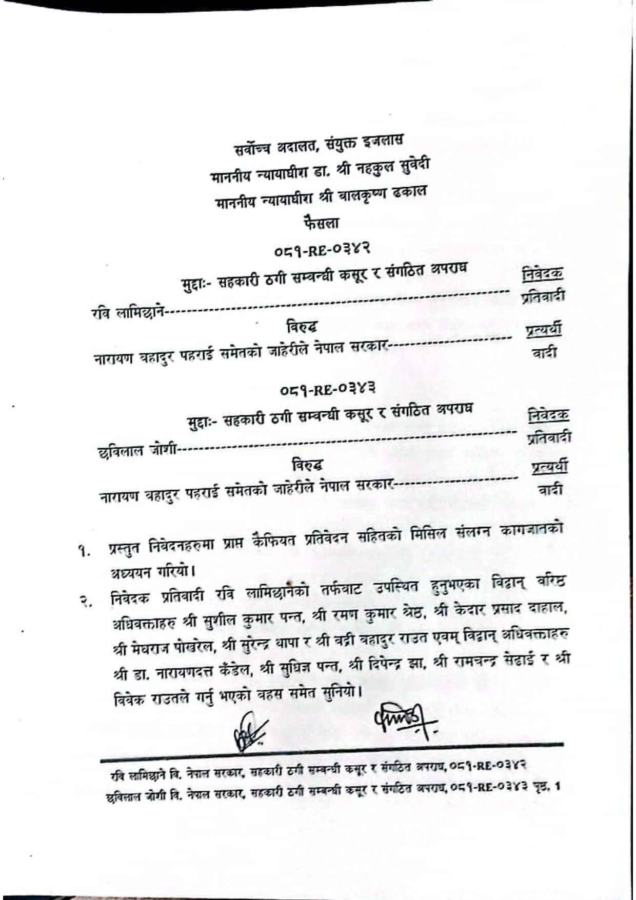 राष्ट्रिय स्वतन्त्र पार्टी (रास्वपा)का सभापति रवि लामिछानेको बन्दीप्रत्यक्षीकरण रिट जारी गर्न सर्वोच्च अदालतले अस्वीकार गरेको हो । न्यायाधीशहरू डा. नहकुल सुवेदी र बालकृष्ण ढकालको इजलासले लामिछानेको थुना गैरन्यायिक नभएको भन्दै बन्दी प्रत्यक्षीकरणको रिट जारी गर्न अस्वीकार गरेको हो । तुलसीपुर आदेशलाई सदर गरेको सर्वोच्चका प्रवक्ता अच्युत कुइँकेलले जानकारी दिए ।