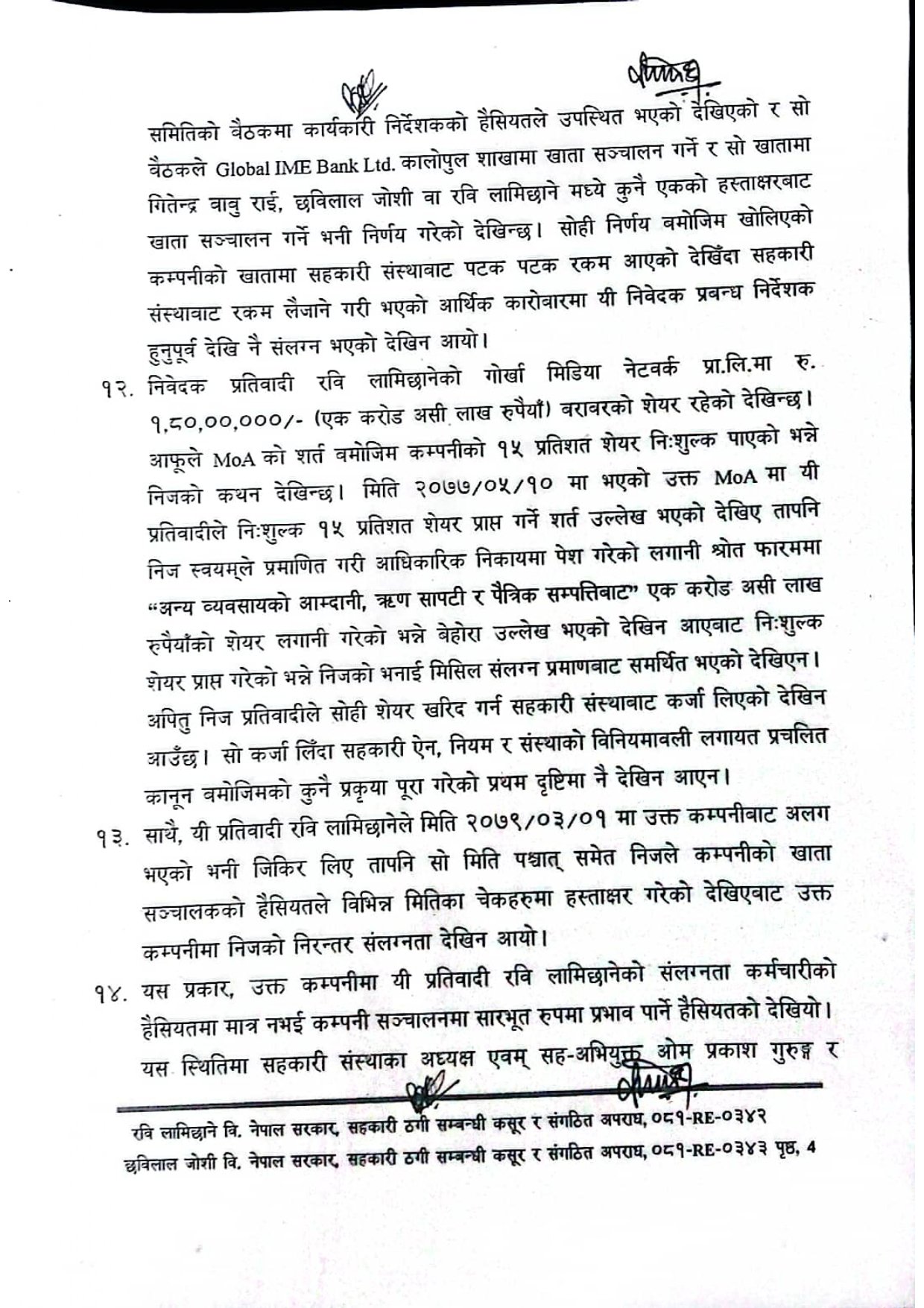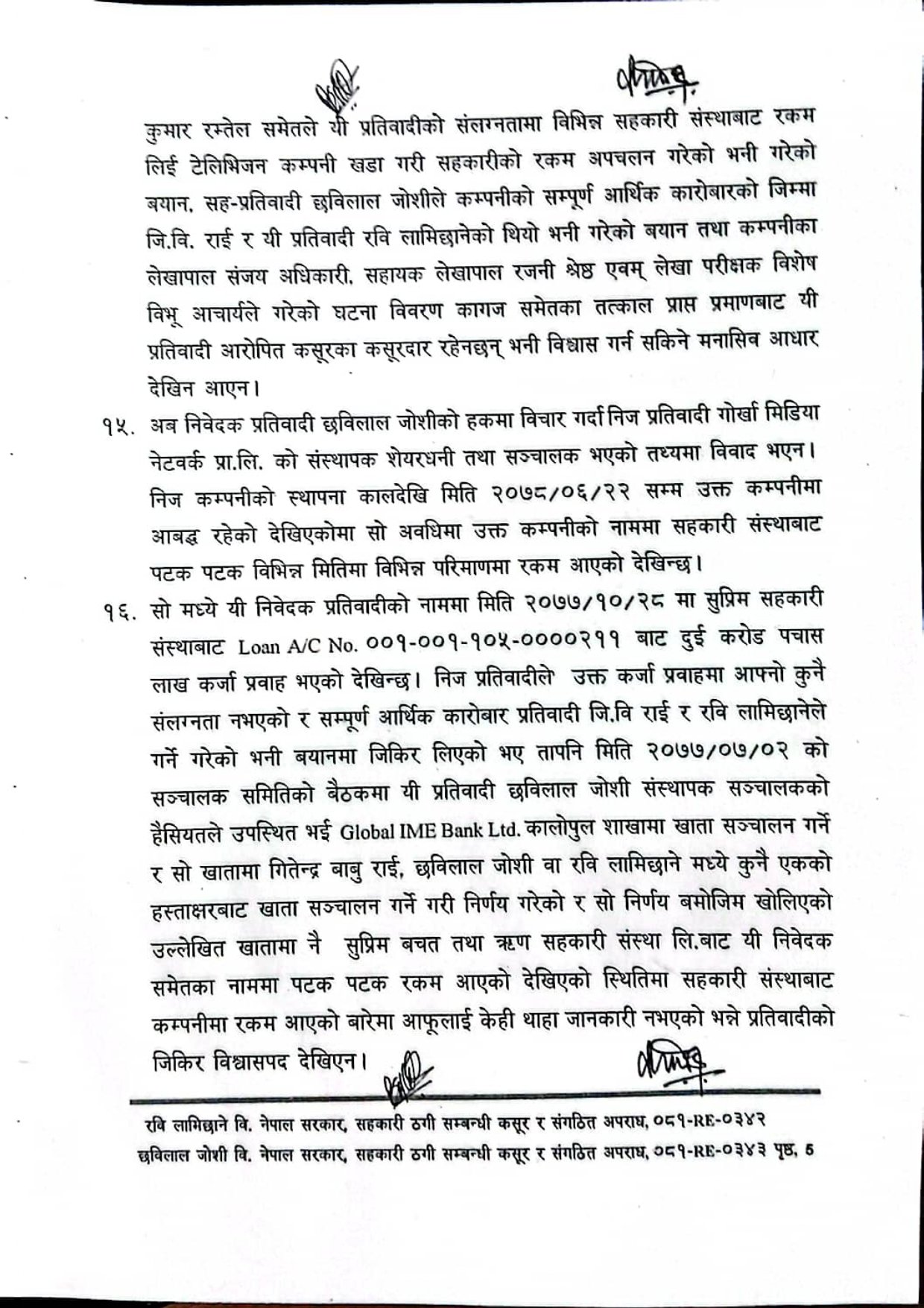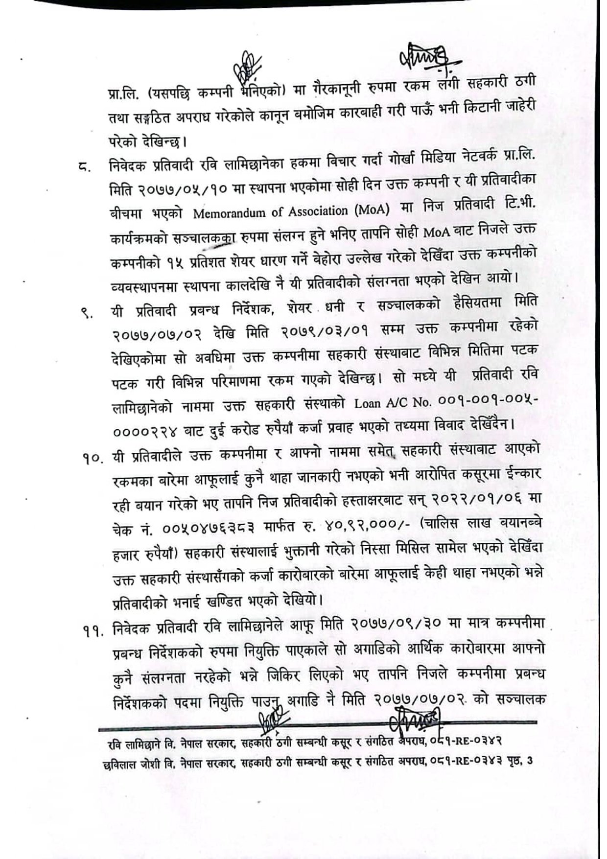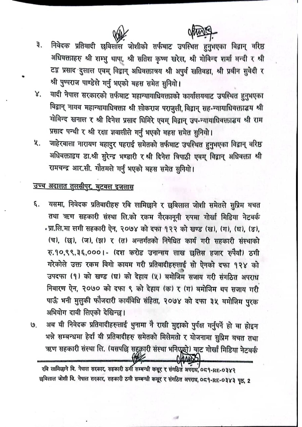 चार सहकारी ठगी मुद्दामा दुई करोड ७९ लाख बुझाइसकेका रविको यो बुटवलस्थित सुप्रिम सहकारी ठगीको मुद्दा हो । पोखराको सूर्यदर्शन सहकारी ठगीमा ६५ लाख, काठमाडौंको स्वर्णलक्ष्मी सहकारी ठगीमा ६० लाख, चितवनको साहारा चितवन बहुउद्देश्यीय सहकारी ठगीमा ५४ लाख र बुटवलको सुप्रिम सहकारी ठगीमा एक करोड धरौटीको आदेश पाएका लामिछानेले सबै आदेशमा पुनरावेदन गरेका छन् ।