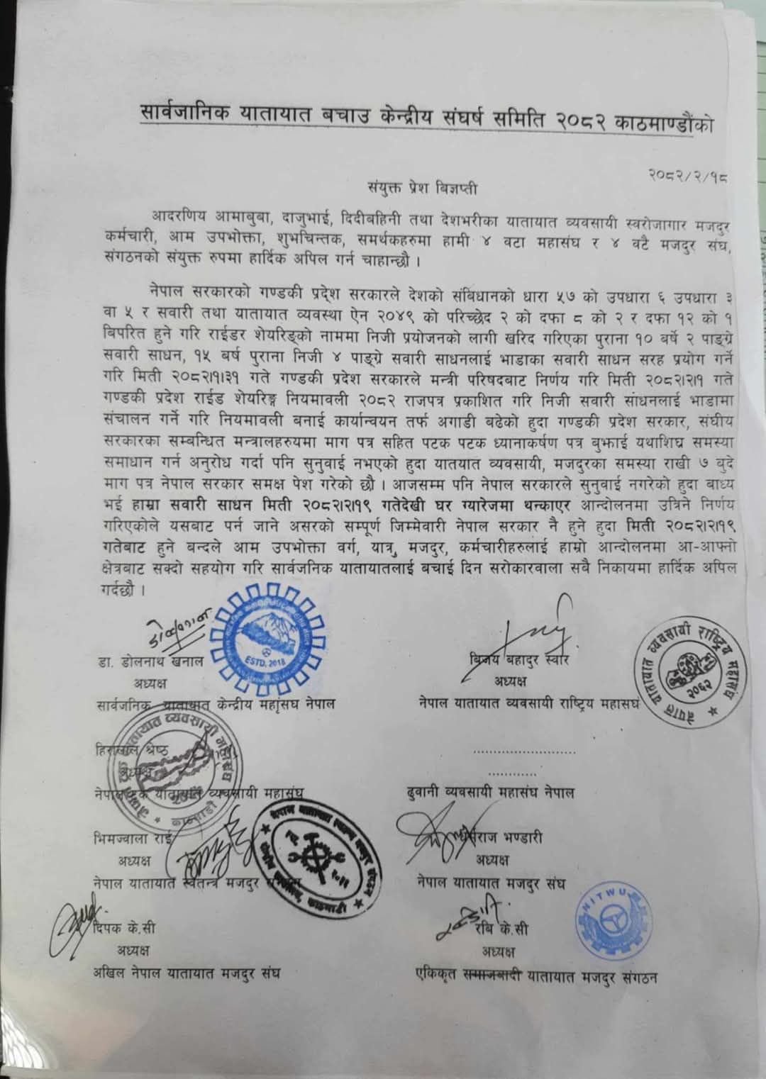 यसैबीच आइतबार ‘सार्वजनिक यातायात बचाउ केन्द्रीय संघर्ष समिति’को नामबाट जारी भएको विज्ञप्तिमा भनिएको छ, ‘यसबाट पर्न जाने असरको सम्पूर्ण जिम्मेवारी नेपाल सरकार नै हुने हुँदा मिति २०८२।।र१९ गतेबाट हुने बन्दले आम उपभोक्ता वर्ग, यात्रु, मजदुर, कर्मचारीहरूलाई हाम्रो आन्दोलनमा आ–आफ्नो क्षेत्रबाट सक्दो सहयोग गरी सार्वजनिक यातायातलाई बचाई दिन सरोकारवाला सबै निकायमा हार्दिक अपिल गर्दछौँ ।’