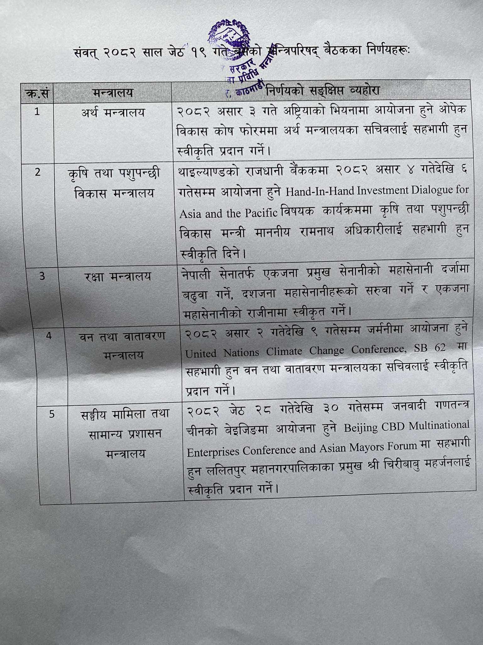जेठ १५ र १९ गते बसेकाे मन्त्रिपरिषद् बैठकका १४ निर्णय सार्वजनिक (सूचीसहित)