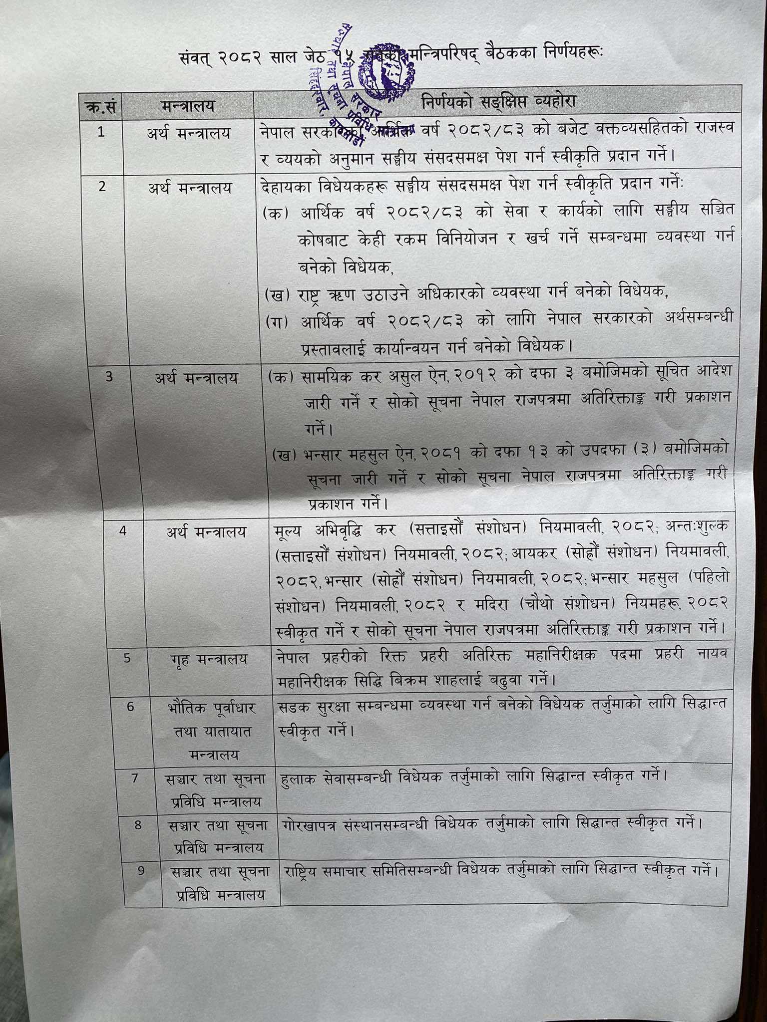 जेठ १५ र १९ गते बसेकाे मन्त्रिपरिषद् बैठकका १४ निर्णय सार्वजनिक (सूचीसहित)