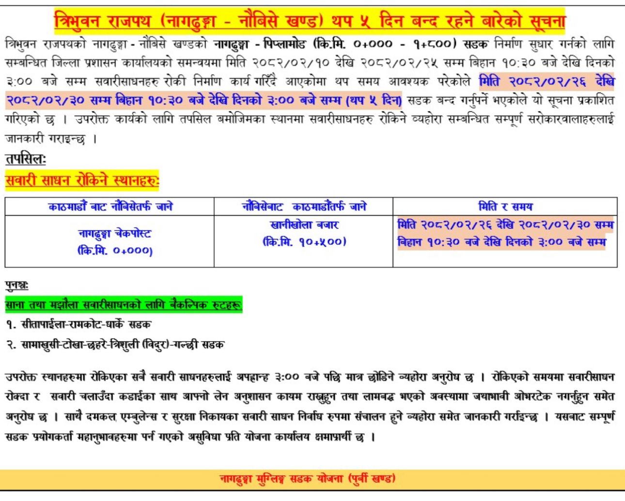 सो समयमा साना सवारीसाधनलाई वैकल्पिक मार्ग सितापाइला- रामकोट- धार्के र समाखुसी-टाेखा छहरे- त्रिशुली-गल्छी प्रयोग गर्न सडक निर्माण आयोजनाले आग्रह गरेको छ ।