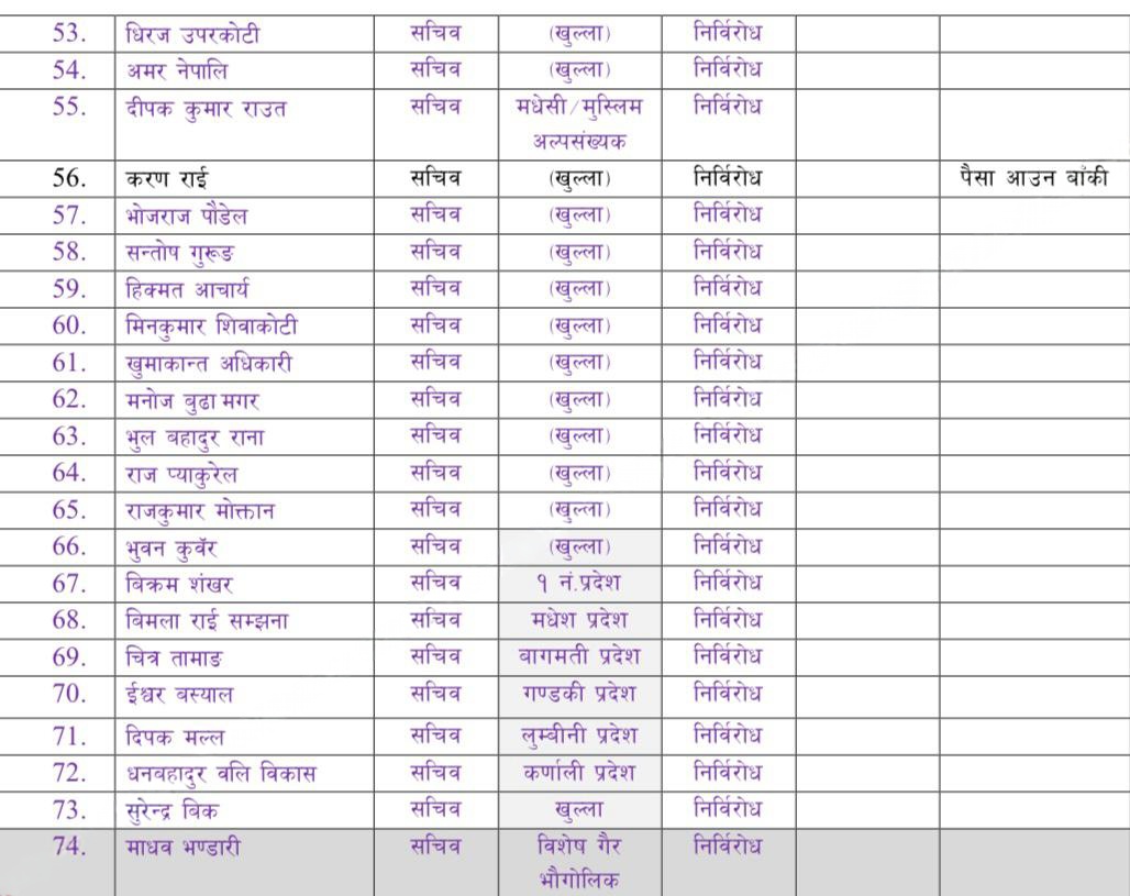 उपाध्यक्षमा डम्बर पुलामी, ठाकुर सौराग, नवराज ऐर, सुदीप नगरकोटी, रामकुमार श्रेष्ठ, अविलास तामाङ, हरिप्रसाद ढकाल, माधव बस्नेत, मनोज बिक, प्रेम श्रेष्ठ, अरुण श्रेत्री, अर्जुनसिंह साउद, शंकर पौडेल, शैलेन्द्रकुमार शर्मा, मिमसरा बम, नवीन खड्का, सन्तोष पनेरु, शोभाराम भण्डारी, अकिल शाही, मिना चैदरा र सुशिला कुँवर रहेका छन्।