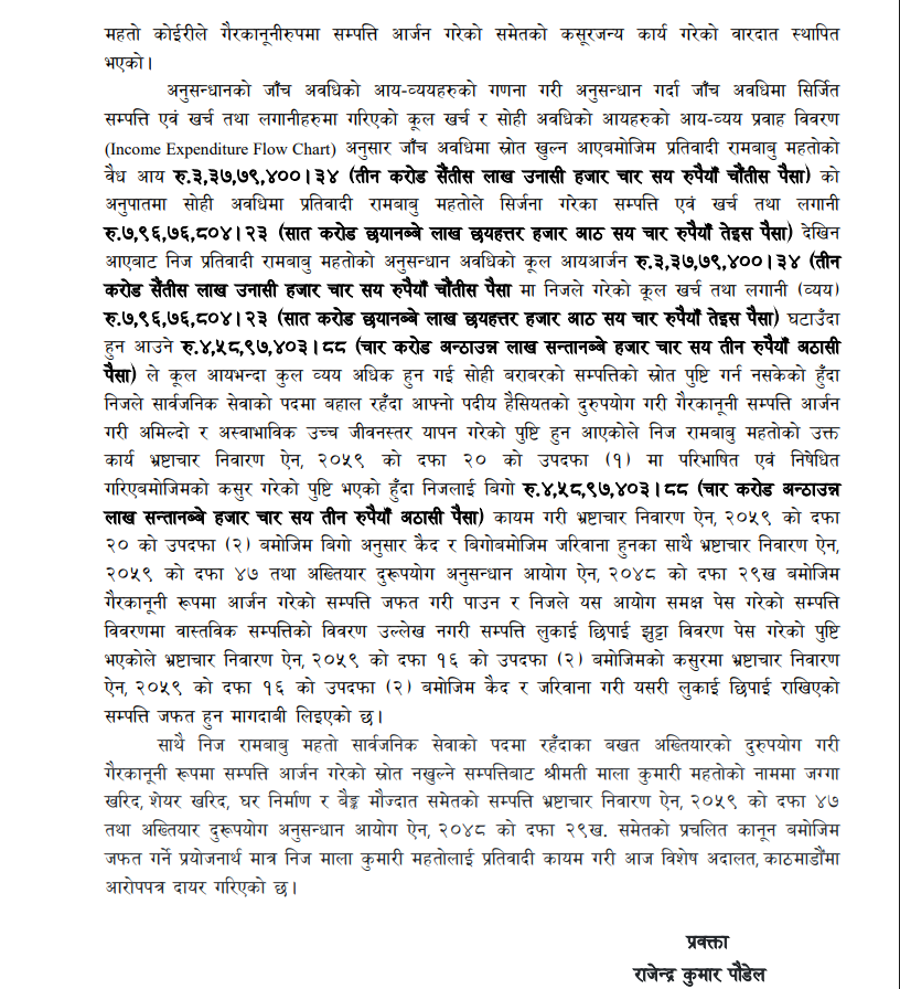 गैरकानूनी रूपमा सम्पत्ति आर्जन गरी भ्रष्टाचार गरेको सम्बन्धी आरोपमा काठमाडौँ महानगरपालिकाका तत्कालीन इन्जिनियर (उपनिर्देशक) रामबाबु महतो कोइरीविरुद्ध मुद्दा दायर गरिएको हो ।