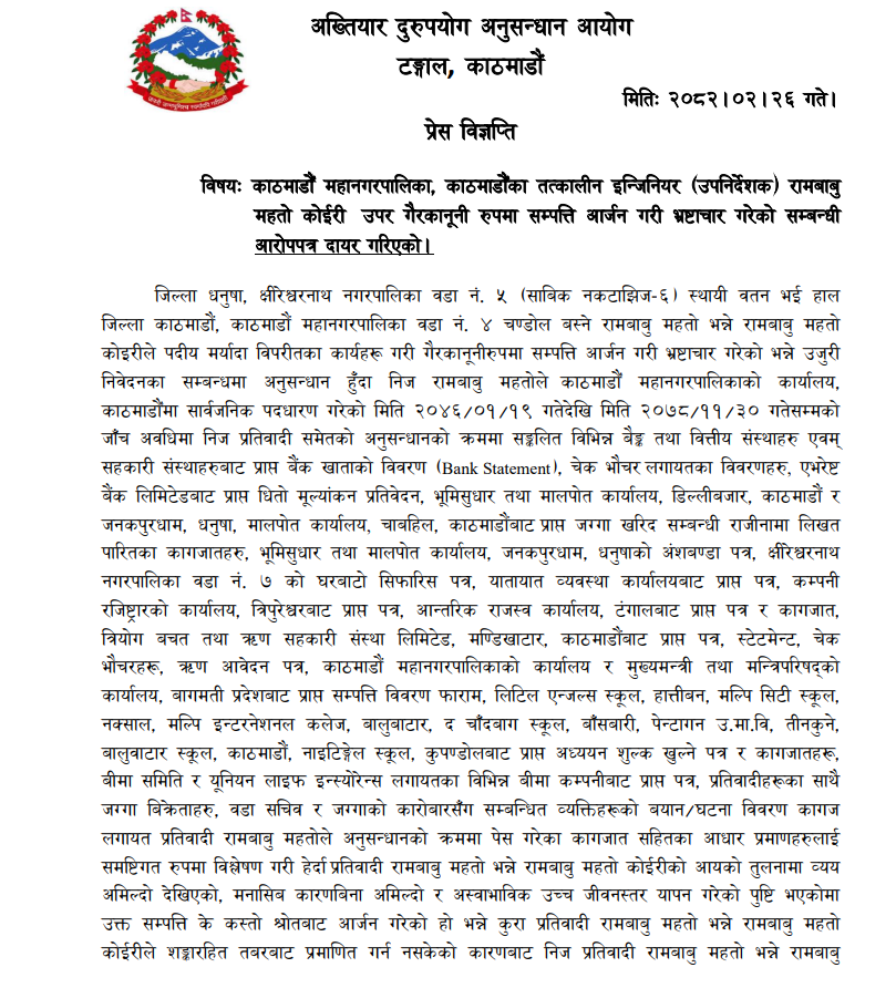 गैरकानूनी रूपमा सम्पत्ति आर्जन गरी भ्रष्टाचार गरेको सम्बन्धी आरोपमा काठमाडौँ महानगरपालिकाका तत्कालीन इन्जिनियर (उपनिर्देशक) रामबाबु महतो कोइरीविरुद्ध मुद्दा दायर गरिएको हो ।