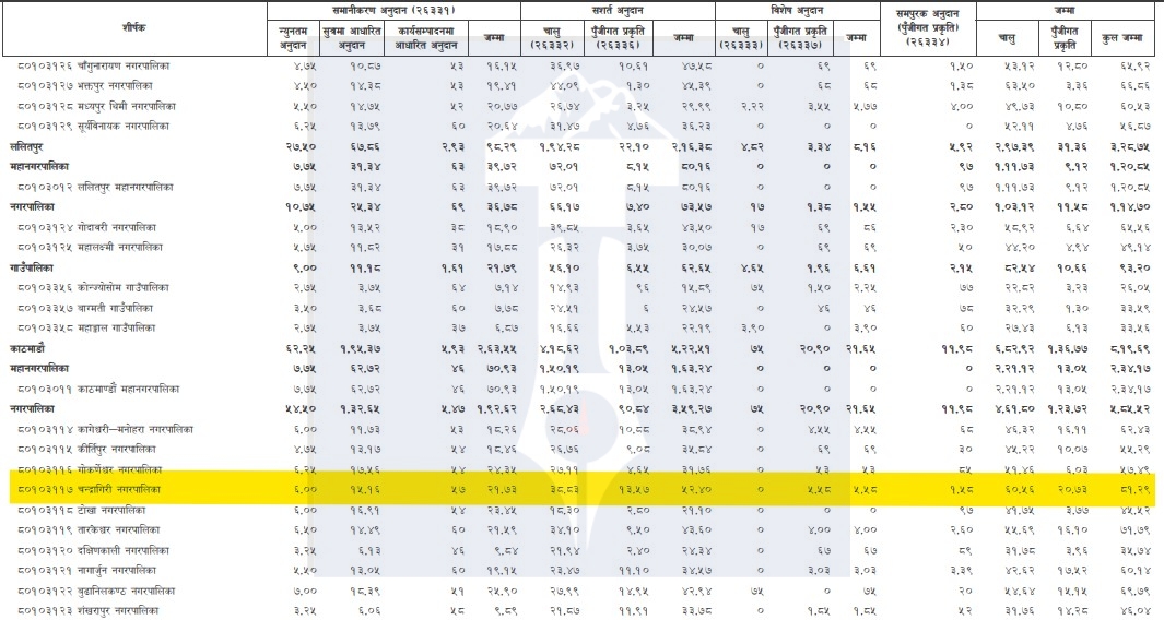 पुँजीगत प्रकृतिको समपुरक अनुदानतर्फ चन्द्रागिरि नगरले १ करोड ५८ लाख रुपैयाँ पाउनेछ ।
