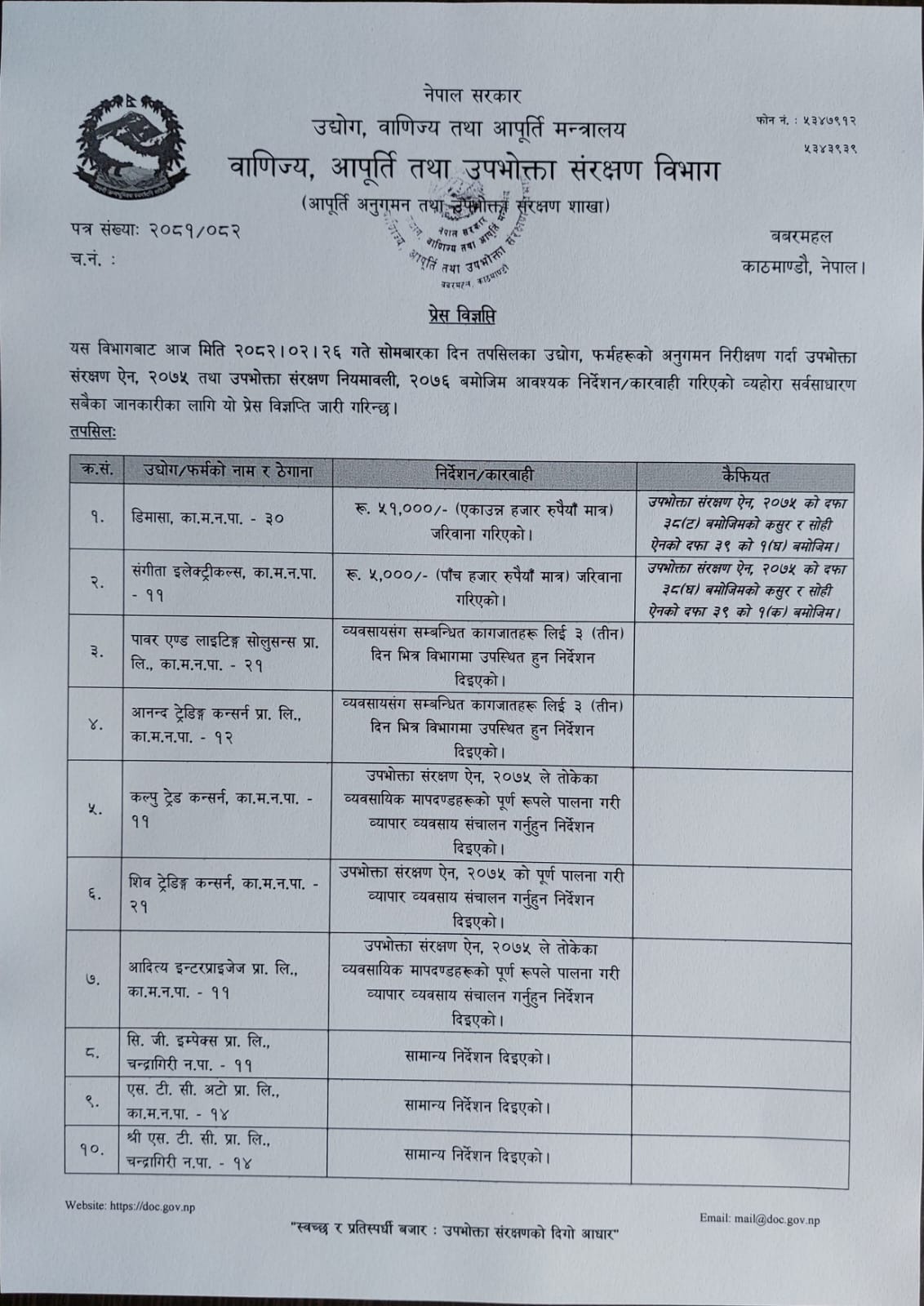 उद्योग, वाणिज्य तथा आपूर्ति मन्त्रालय अन्तर्गत वाणिज्य, आपूर्ति तथा उपभोक्ता संरक्षण विभागले सोमबार काठमाडौं उपत्यकास्थित विभिन्न १० वटा उद्योग तथा फर्महरूको अनुगमन गरी जरिवाना तथा निर्देशन जारी गरेको छ ।