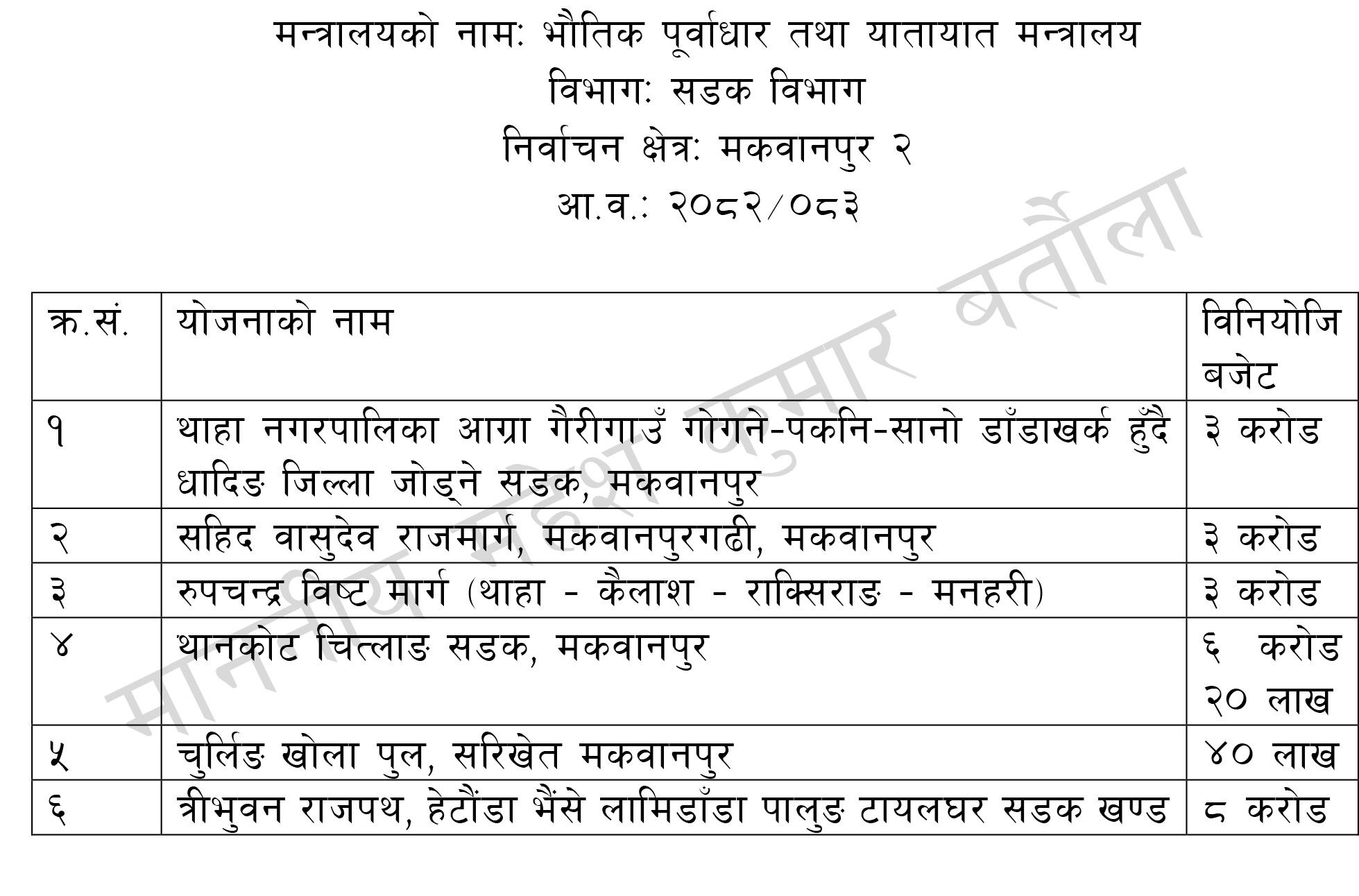 मकवानपुर क्षेत्र नं. २ का संघीय सांसद् महेश बर्ताैलाका अनुसार भाैतिक पूर्वाधार तथा यातायात मन्त्रालय अन्तर्गत कार्यान्वयन हुने गरी सो बजेट विनियोजन गरिएको हो ।