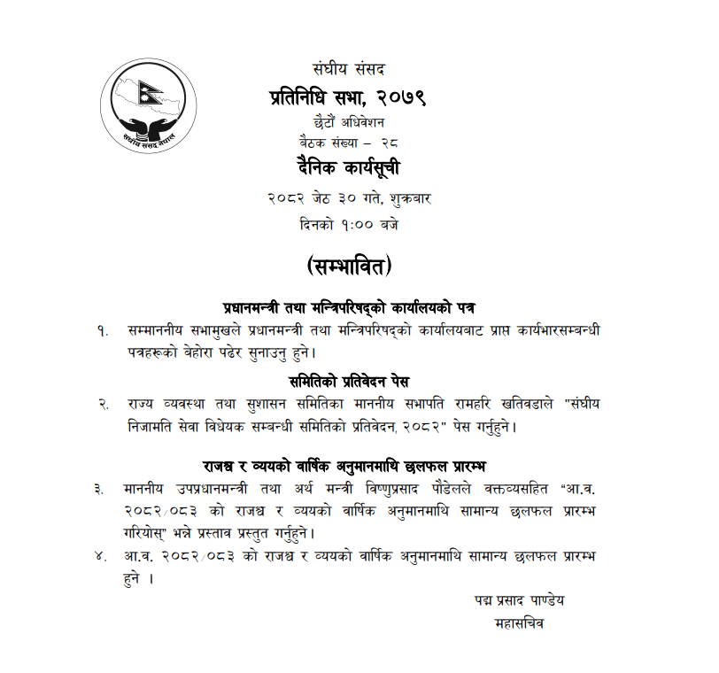 प्रतिनिधि सभा बैठकमा उपप्रधानमन्त्री एवम् अर्थमन्त्री विष्णुप्रसाद पौडेलले वक्तव्यसहित ‘आर्थिक वर्ष २०८२–८३ को राजश्व र व्ययको वार्षिक अनुमानमाथि सामान्य छलफल गरियोस्’ भन्ने प्रस्ताव पेस गर्ने र सो प्रस्तावमाथि छलफल हुने सम्भावित कार्यसूची छ ।