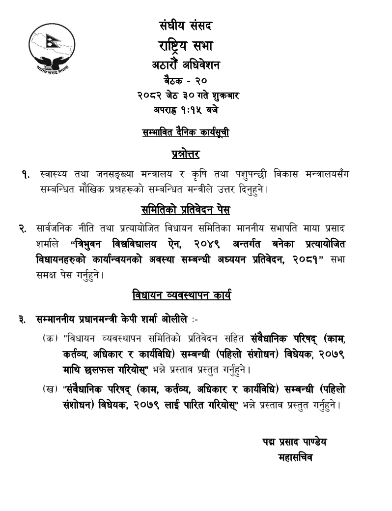 प्रतिनिधि सभाको बैठक दिउँसो १ बजे बस्नेछ भने राष्ट्रियसभा बैठक दिउसो १ः१५ बजे बस्नेछ ।