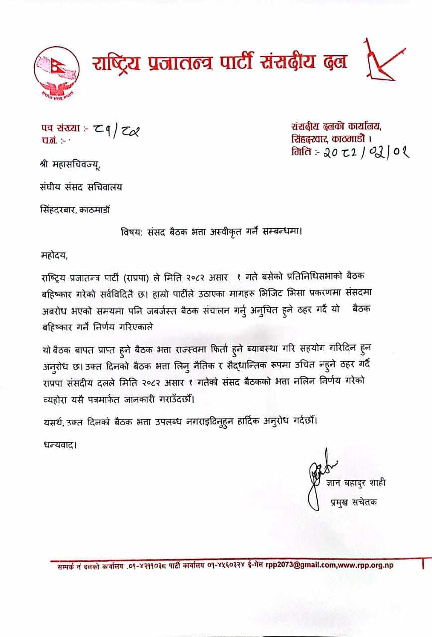 राष्ट्रिय प्रजातन्त्र पार्टी (राप्रपा) संसदीय दलले असार १ गते प्रतिनिधिसभा बहिष्कार गरेको दिनको बैठक भत्ता अस्वीकृत गर्ने निर्णय गरेको छ।