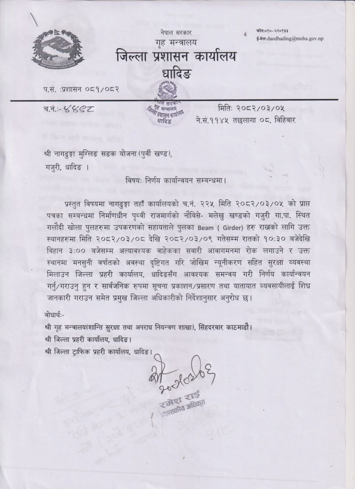 राति १०ः३० देखि बिहान ३ बजेसम्म अत्यावश्यक बाहेकका सवारीसाधन सञ्चालन नगर्न जिल्ला प्रशासन कार्यालय धादिङले आग्रह गरेको हो।