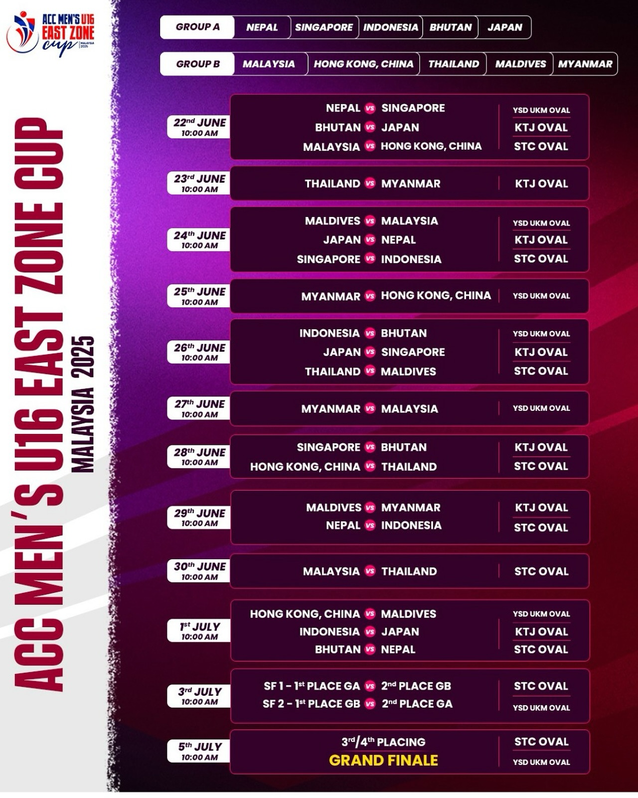 मलेसिया आइतबारदेखि (आज) एसीसी पुरुष यू–१६ पूर्वी क्षेत्रीय क्रिकेट प्रतियोगिता हुँदैछ । एसियाली क्रिकेट परिषद् (एसीसी)को वार्षिक कार्यतालिका अनुसार उक्त प्रतियोगिता हुन लागेको हो ।