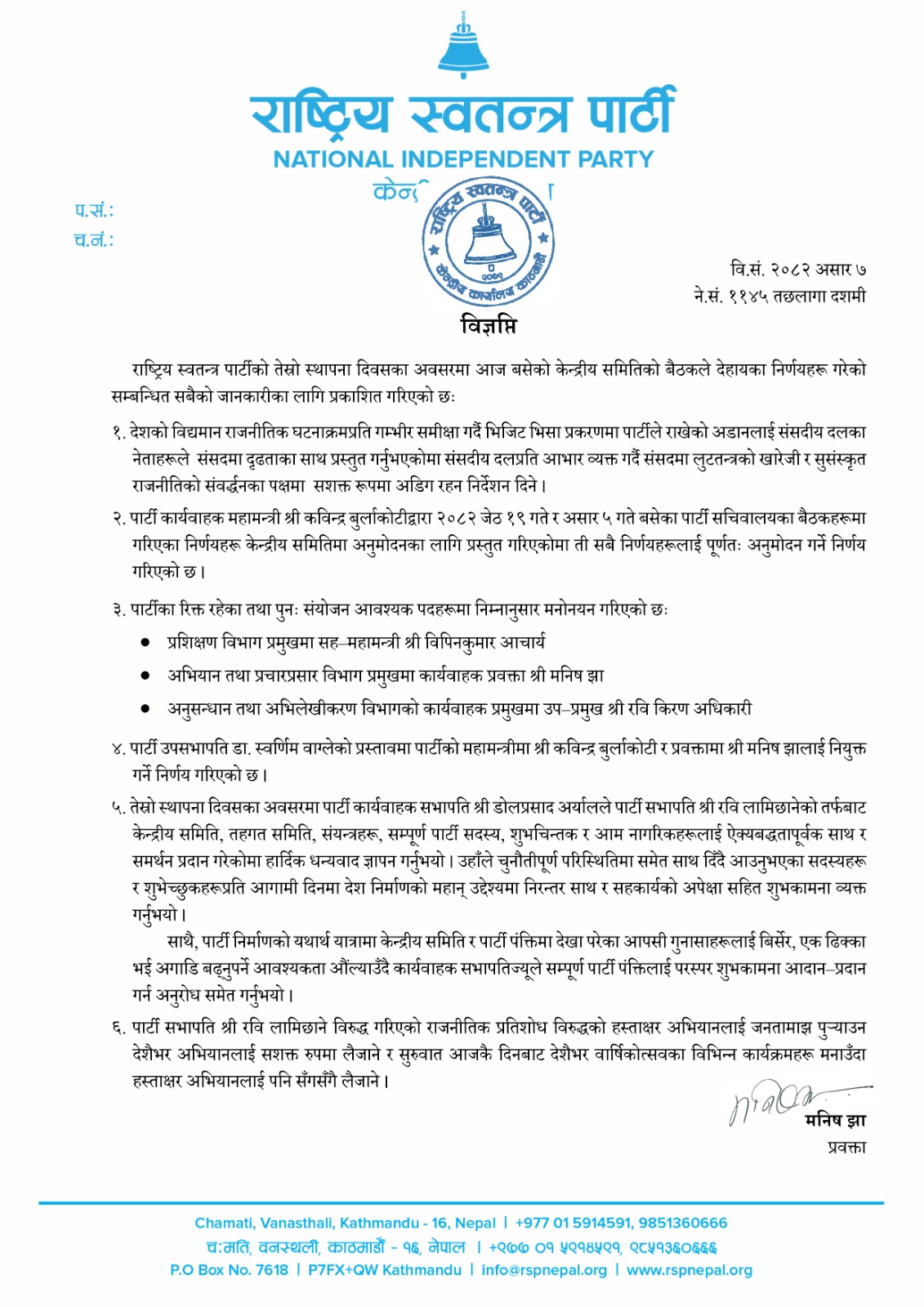 त्यस्तै अभियान तथा प्रचारप्रसार विभाग प्रमुखमा कार्यवाहक प्रवक्ता मनिष झा तोकिएका छन्।