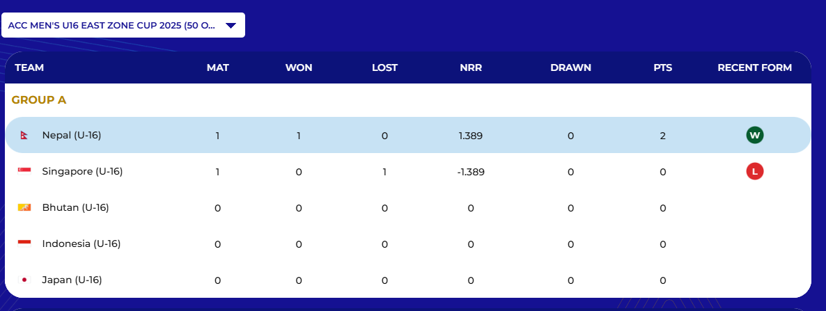 आइतबार मलेसियामा भएको समूह ‘ए’ को खेलमा नेपालले सिंगापुरलाई ६ विकेटले पराजित गरेको हो।