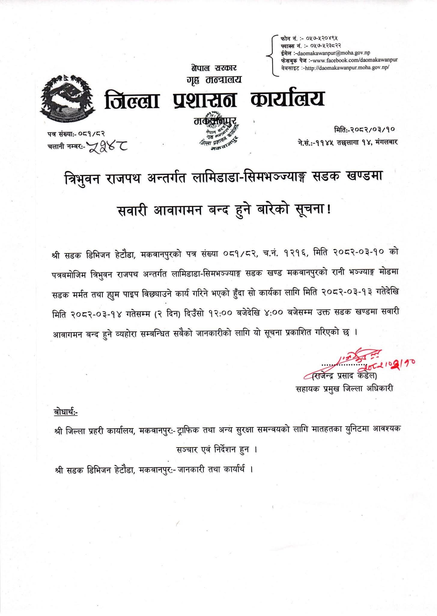 जिल्ला प्रशासन कार्यालय मकवानपुरले सार्वजनिक सूचना जारी गर्दै उक्त सडकखण्डको रानी भञ्ज्याङ मोडमा सडक मर्मत तथा ह्युम पाइप बिच्छ्याउने कार्यका लागि ती दिन मध्यान्ह १२बजेदेखि ४ बजेसम्म सवारीसाधन सञ्चालनमा रोक लगाइने जनाएको हो।