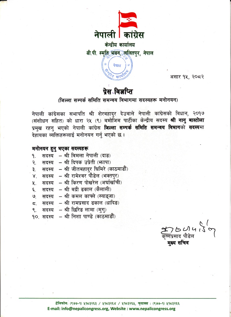 नेपाली कांग्रेसले पार्टीको जिल्ला सम्पर्क समिति समन्वय विभागमा दश जना सदस्य थप गरेको छ ।