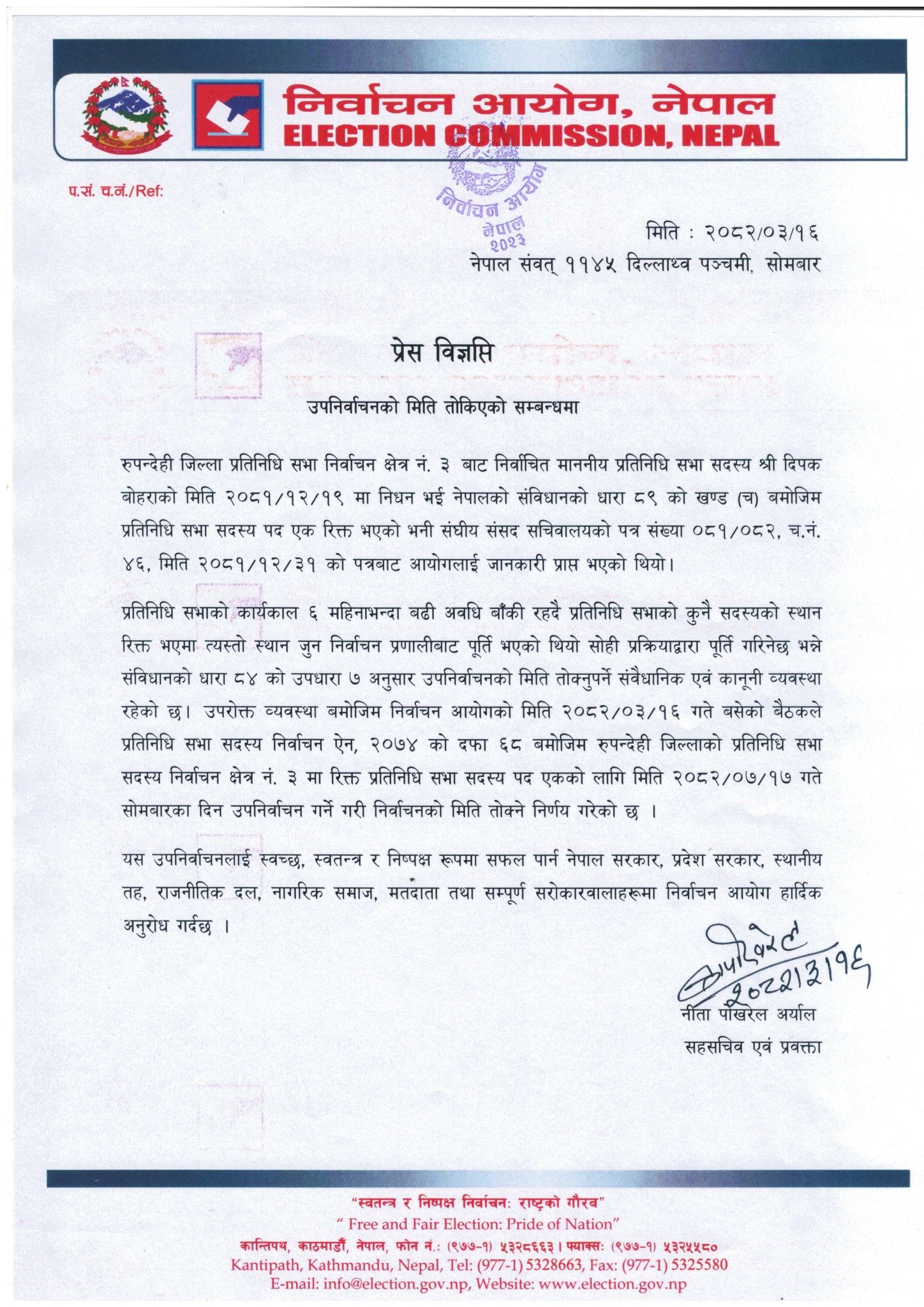 साेमबार निर्वाचन आयोगले काठमाडौँमा पत्रकार सम्मेलन गर्दै उपनिर्वाचन गर्ने मिति सार्वजनिक गरेको हो ।