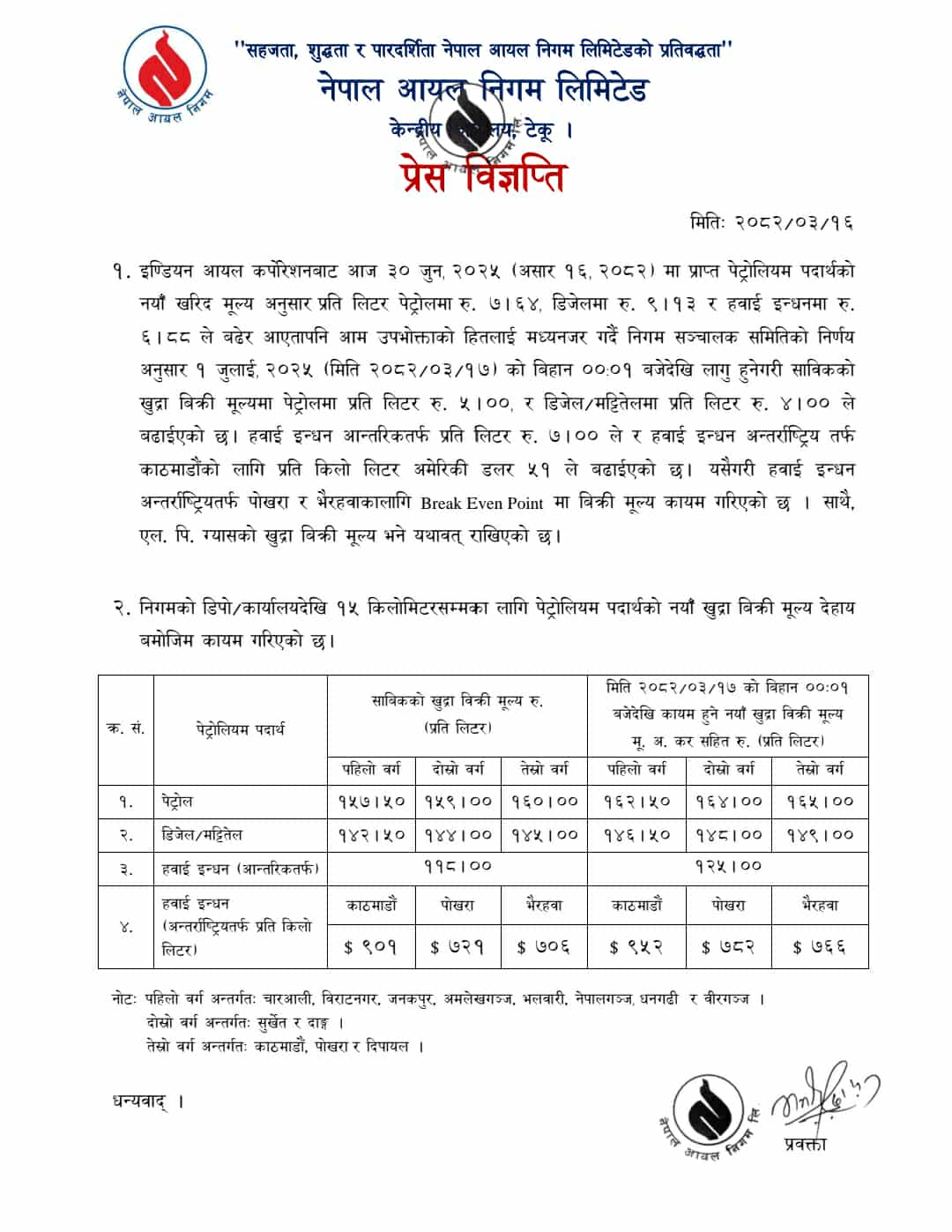 मंगलबार (असार १७) बिहानदेखि लागु हुने गरी पेट्रोल, डिजेल र मट्टीतेलको मूल्य बढाइएको निगमले जनाएको छ ।