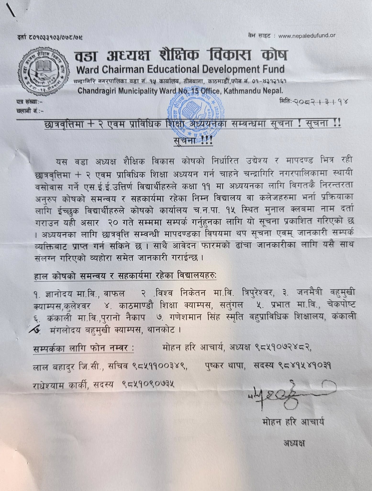 चन्द्रागिरि नगरपालिका वडा नं. १५ मा रहेको वडा अध्यक्ष शैक्षिक विकास कोषले दश जोड २ तहमा अध्ययन गर्ने विद्यार्थीहरूका लागि छात्रवृत्ति उपलब्ध गराउने भएको छ ।