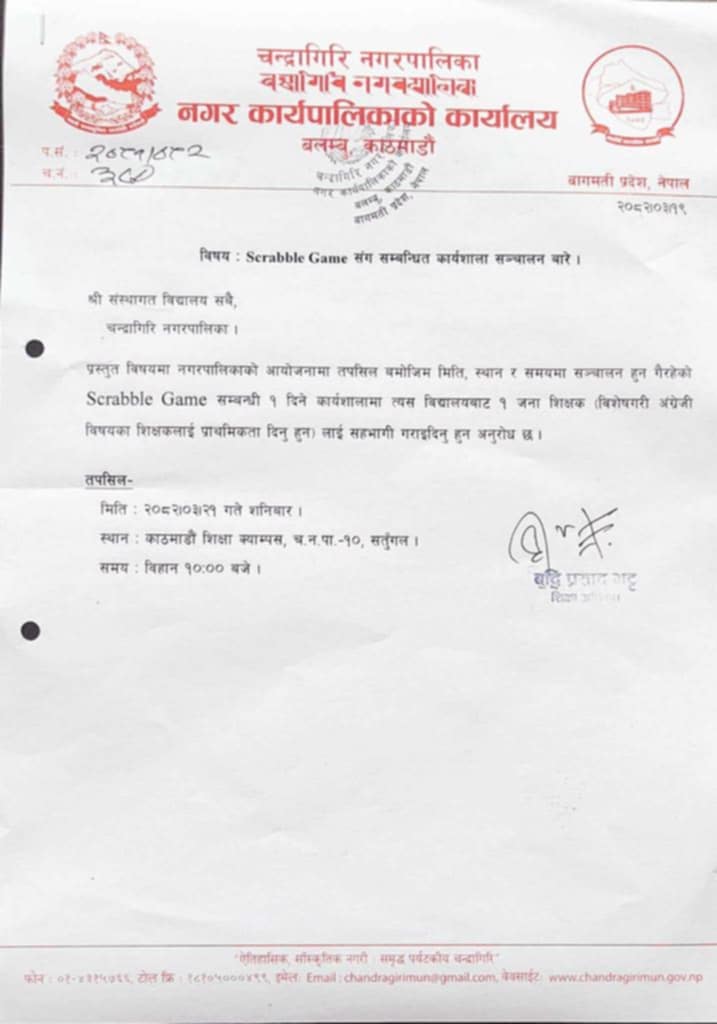 नेपाल स्क्राबल संघ चन्द्रागिरि नगर शाखाको संयोजकत्वमा चन्द्रागिरि नगरका विभिन्न विद्यालयका अंग्रेजी विषय शिक्षण शिक्षकहरूका लागि स्क्राबल तालिम कार्यक्रम सञ्चालन हुने भएको छ ।