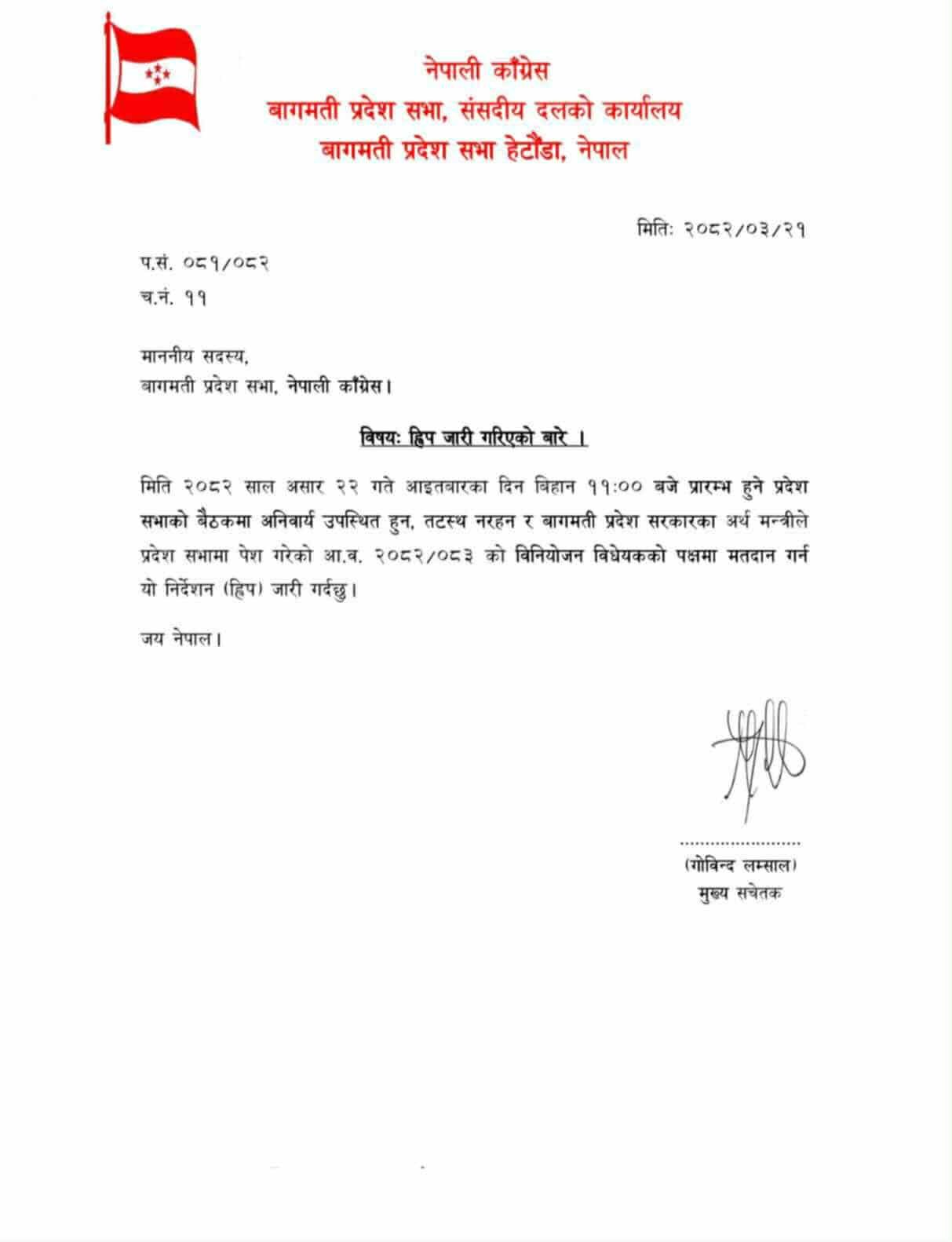 सरकारको बजेट पास गर्ने तीव्र भइरहेका बेला नेपाली कांग्रेस संसदीय दलले आफ्ना सांसदहरूलाई ह्विप जारी गरेको छ। संसदीय दलका प्रमुख सचेतक गोविन्द लम्सालले असार २२ गते बिहान ११ ः ०० बजेका लागि बोलाइएको प्रदेशसभा बैठकमा अनिवार्य रूपमा उपस्थित हुन र पार्टीको निर्देशनअनुसार मतदान गर्न निर्देशन दिएका छन्।